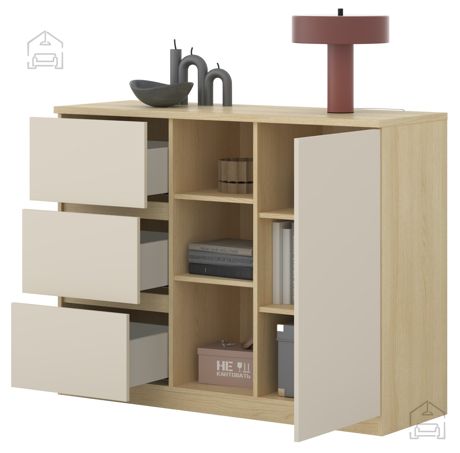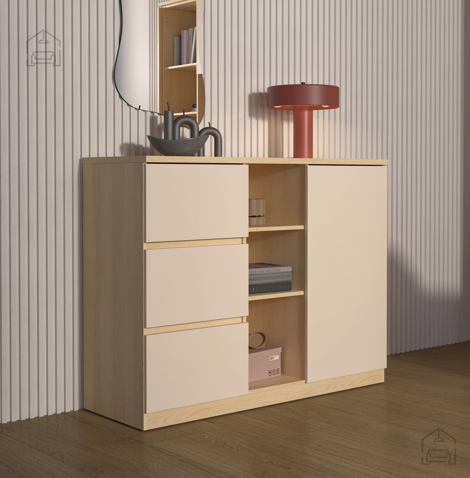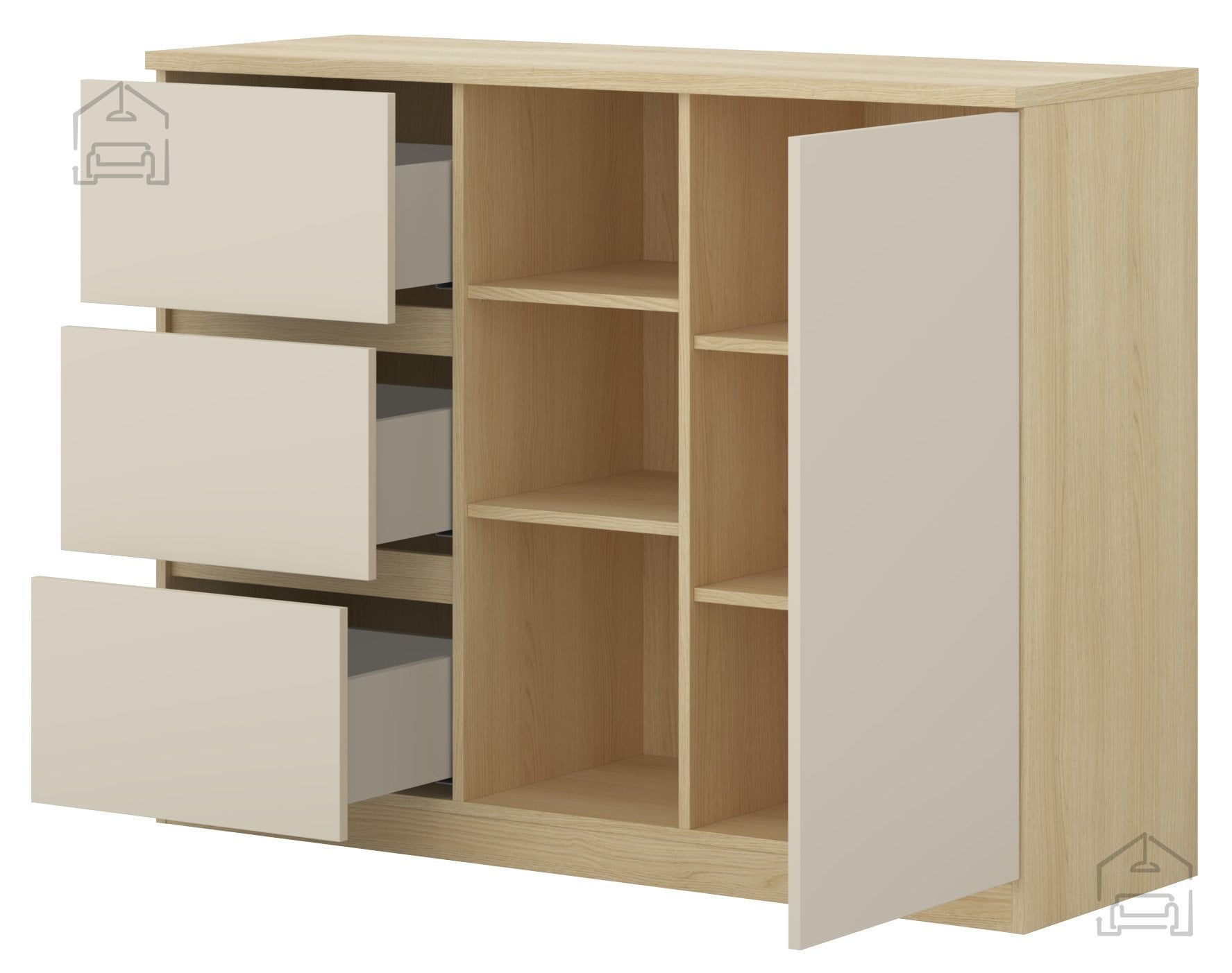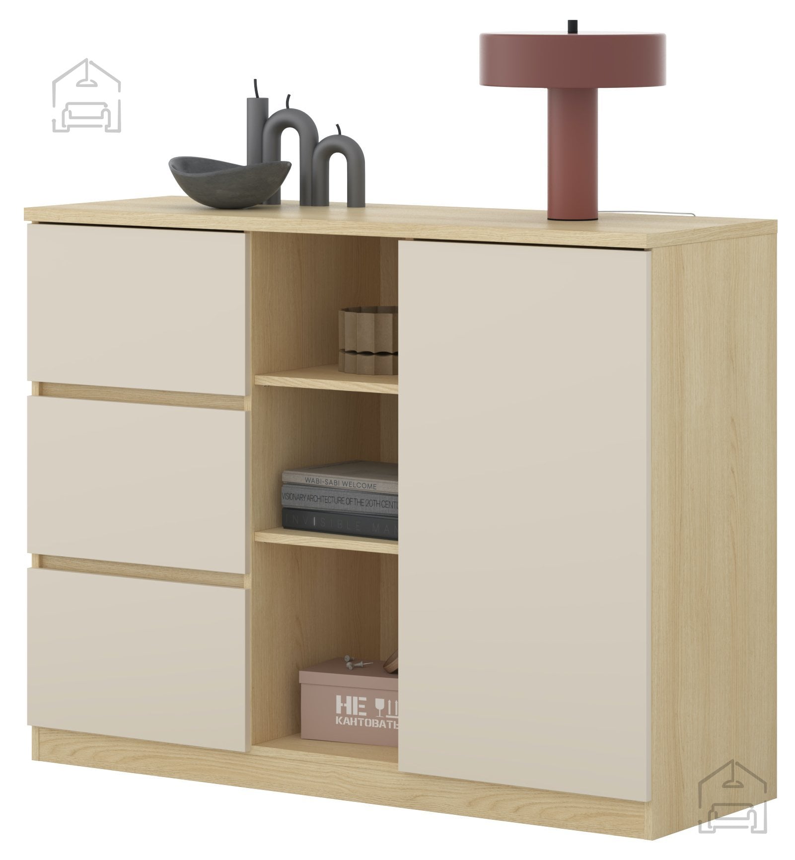 Komoda z regalom Terra – Helvetia Meble je več kot le kos pohištva; je funkcionalen element, ki združuje estetiko, kakovost in uporabnost. Z naravno toplino hrasta Lindberg in nežnim bež tonom se brez težav vključi v vsak dom. Trdna laminirana konstrukcija, zaščiteni robovi in premišljen razpored shranjevalnih površin jo uvrščajo med zanesljive in dolgotrajne rešitve za sodobno bivanje. Če iščete komodo, ki bo hkrati praktična in estetsko dovršena, je model Terra prava izbira za vas.