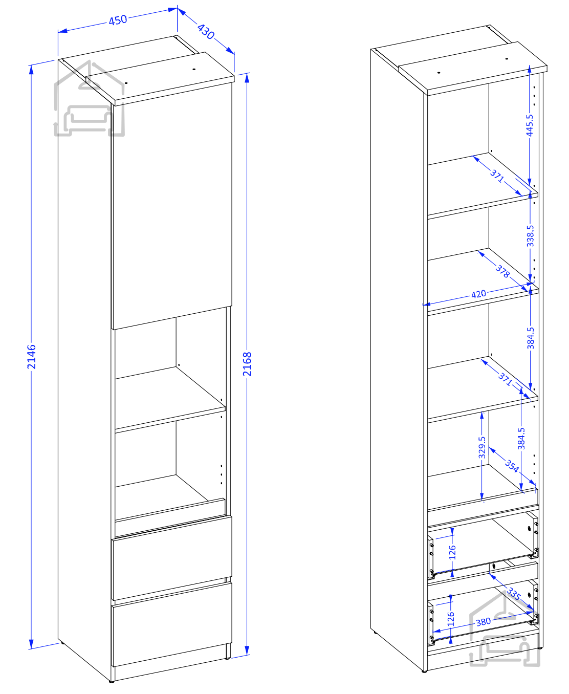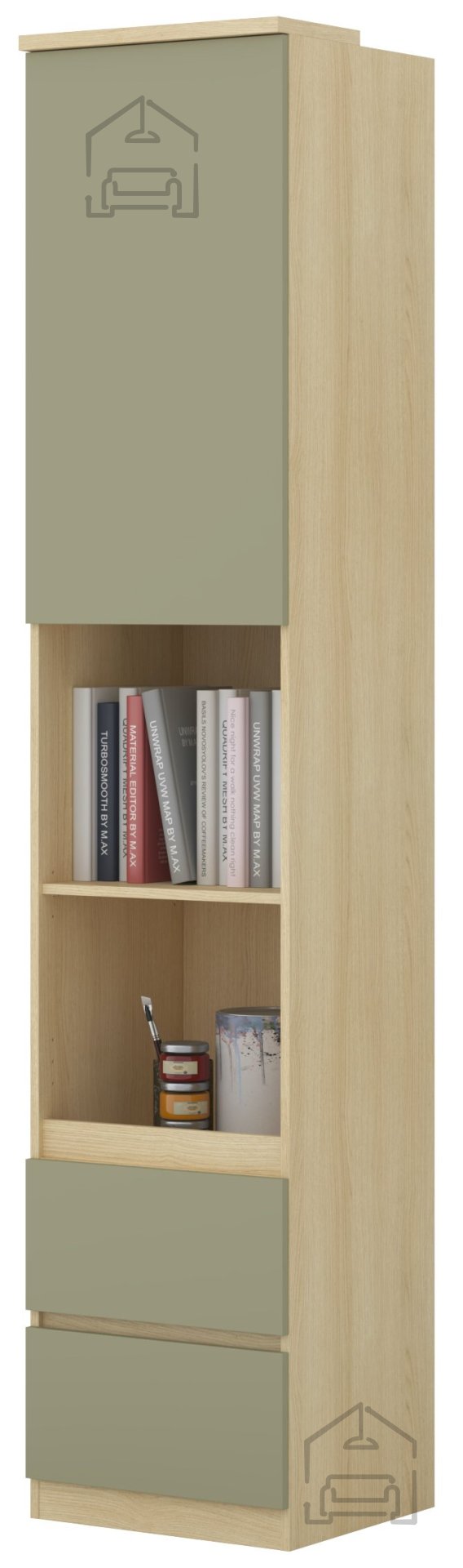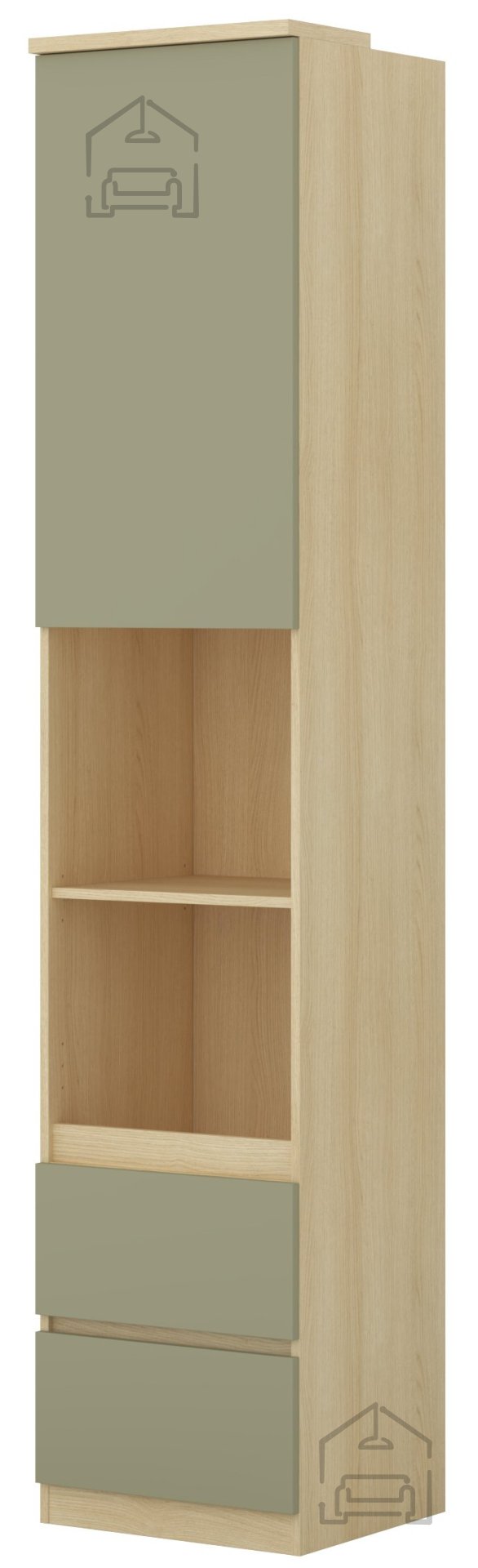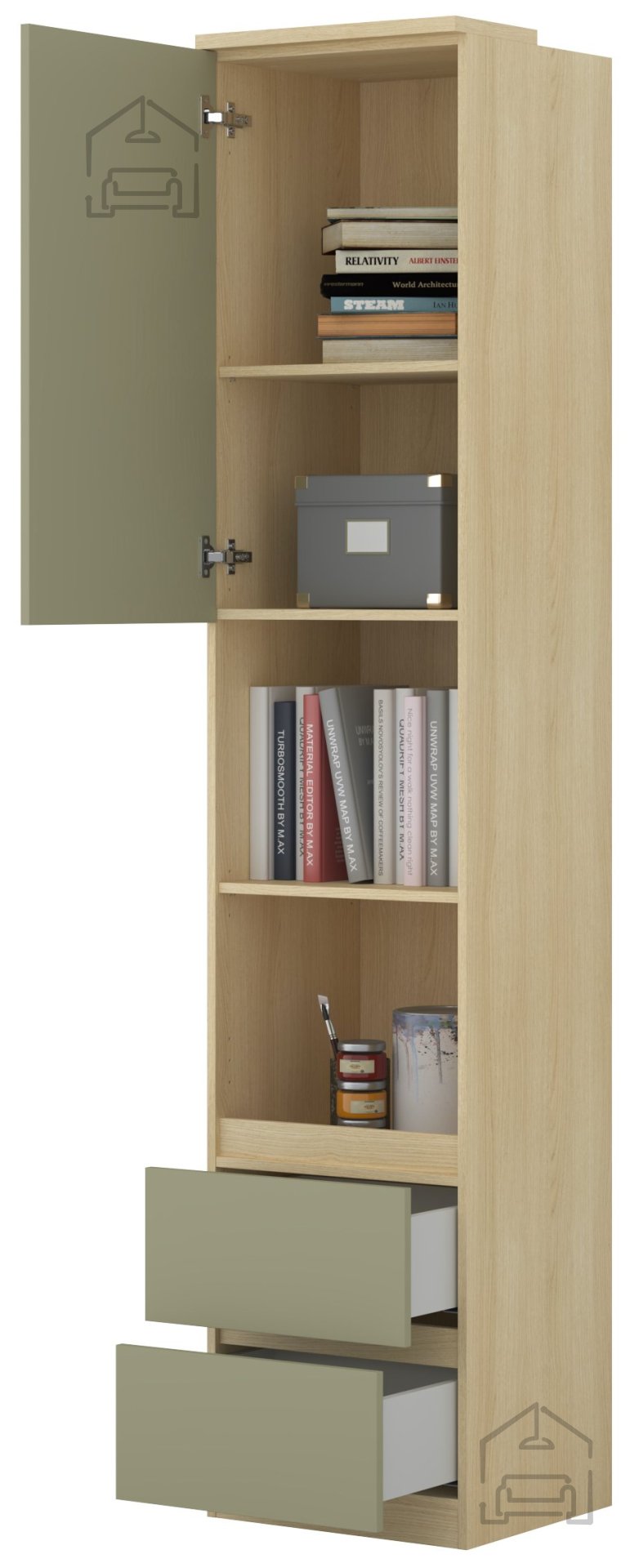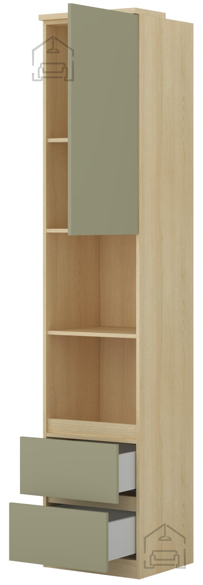 Dimenzije regala znašajo 45x43x215 cm, kar pomeni, da ponuja veliko prostora za shranjevanje, ne da bi zavzel preveč talne površine. Konstrukcija vključuje dva predala in ena vrata, za katerimi se skrivajo police za urejeno shranjevanje knjig, dokumentov ali dekorativnih predmetov. Višina regala omogoča učinkovito izkoriščanje prostora do stropa, zato je primeren tudi za manjše prostore, kjer je pomembna vsaka dodatna polica.