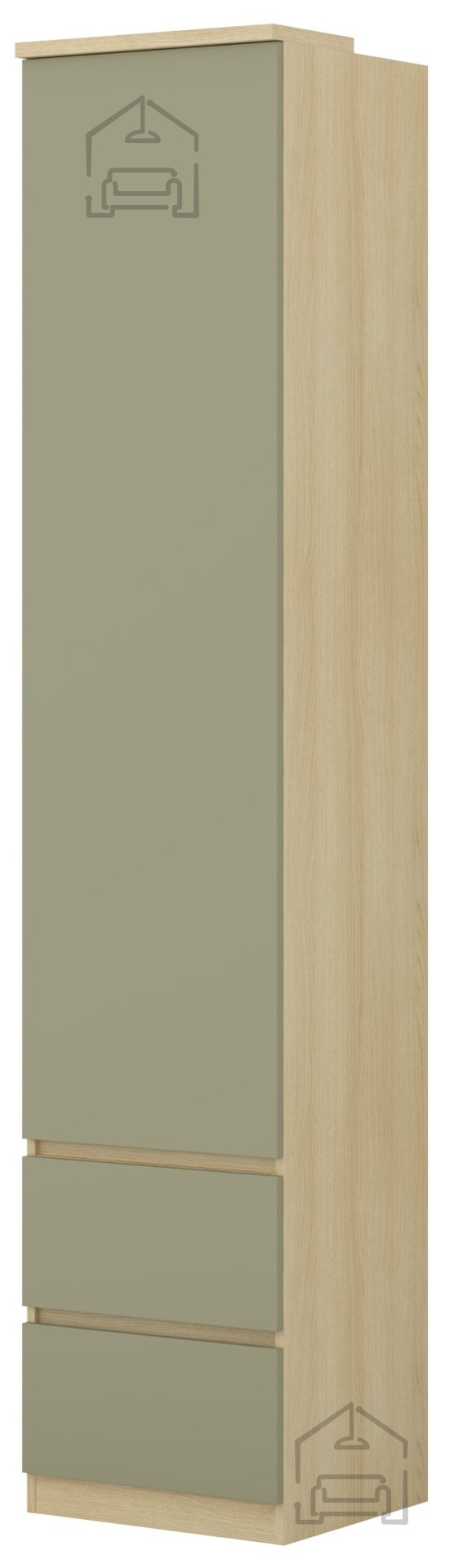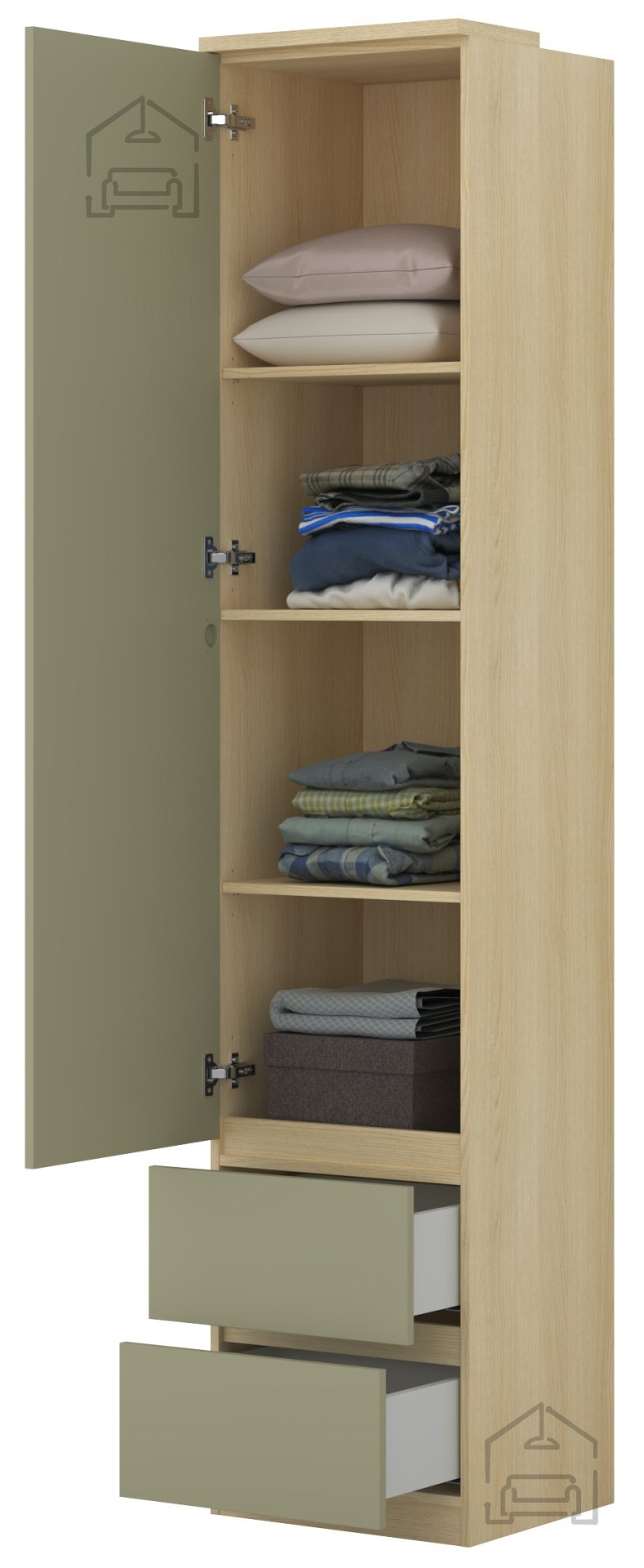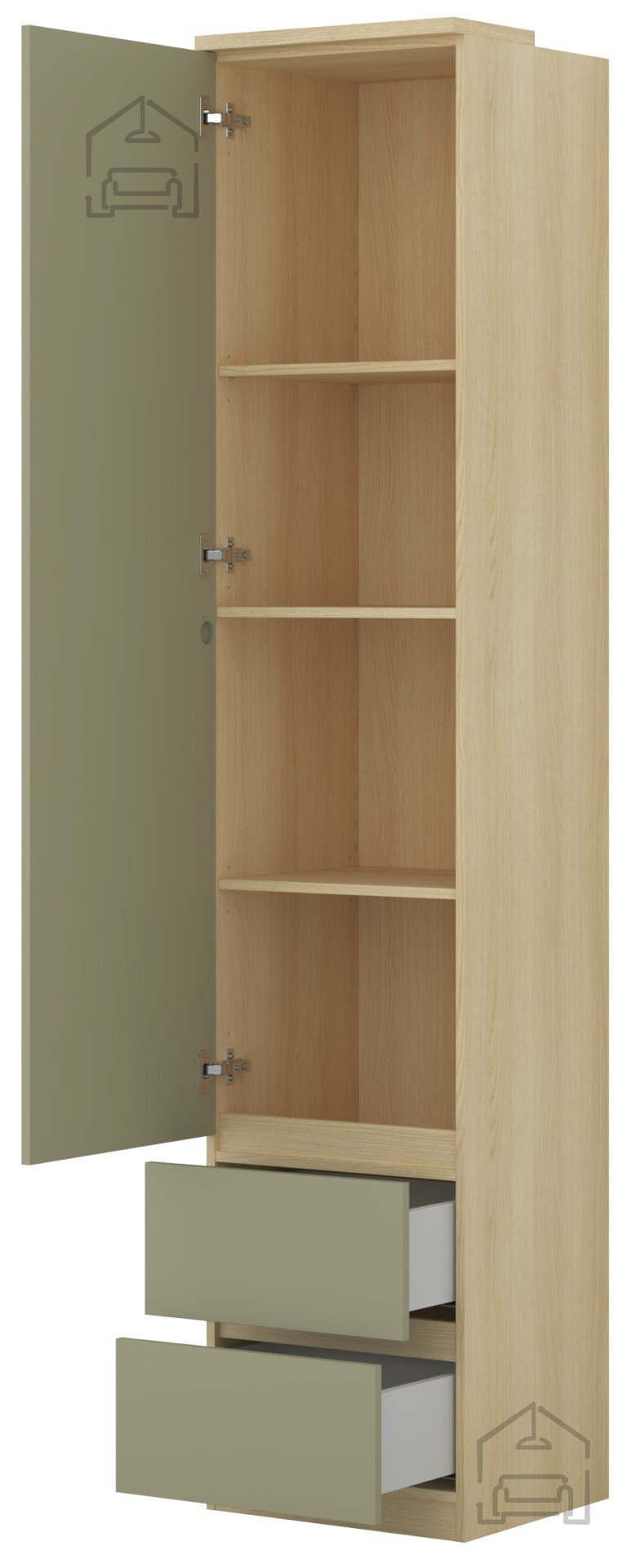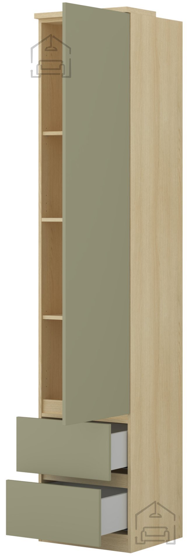 Regal Terra – Helvetia Meble je visok in eleganten kos pohištva, ki združuje naravno toplino dekorja hrasta Lindberg z nežnimi odtenki evkaliptusa. Z dimenzijami 45x43x215 cm ponuja optimalno razmerje med prostornostjo in kompaktnostjo, zato se odlično prilega tako v dnevne sobe kot v domače pisarne ali spalnice. Izdelan je na Poljskem, v priznani tovarni Helvetia Meble, ki je znana po kakovostnih materialih in natančni obdelavi. Laminirana iverna plošča debeline 15 mm zagotavlja stabilnost, trpežnost in enostavno vzdrževanje, robovi iz ABS in papirnatega traku pa ščitijo površine pred obrabo in poškodbami.
