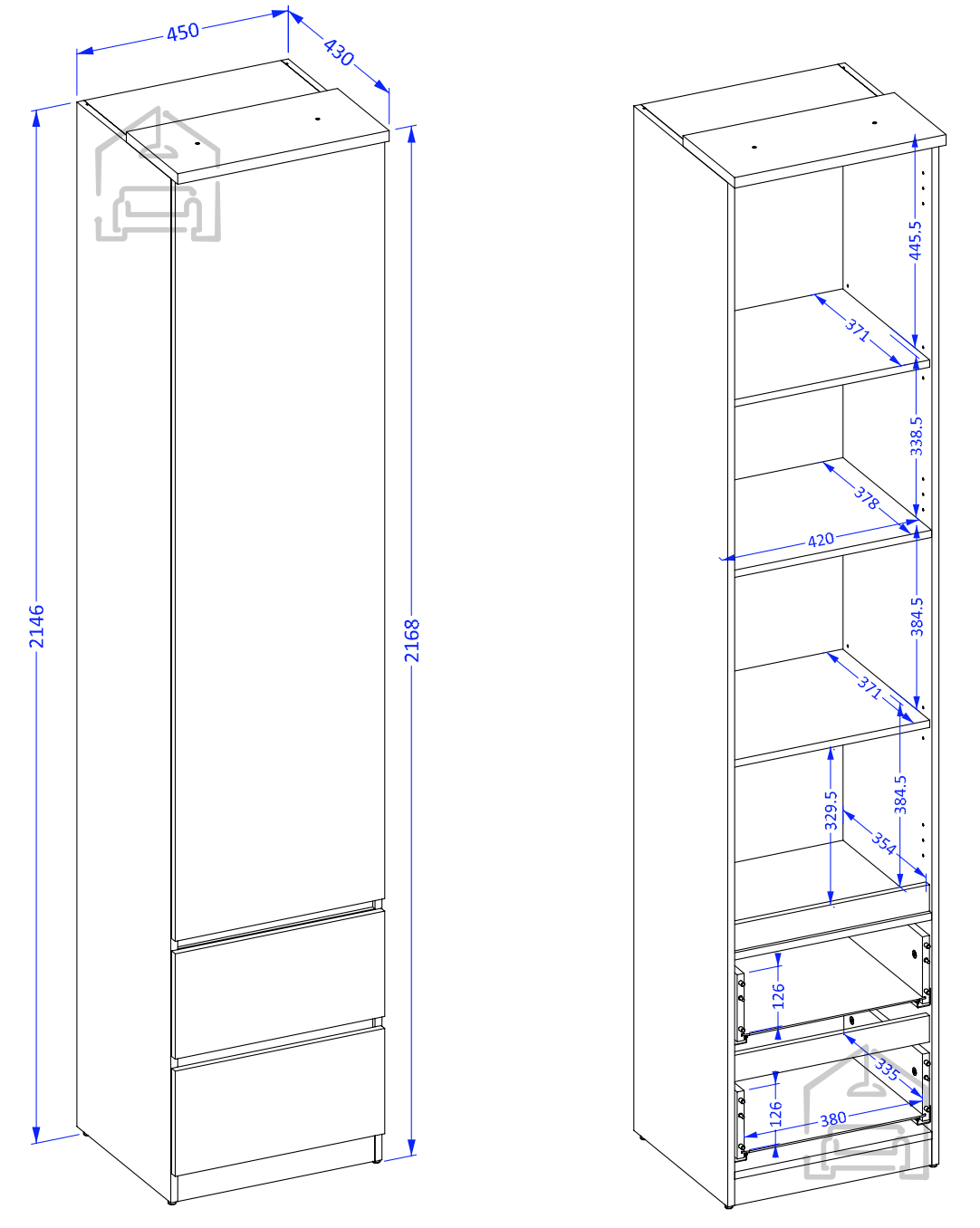 Regal Terra je zasnovan kot knjižna omara z dvema predaloma in enim vratnim elementom. Ta razporeditev omogoča več načinov shranjevanja: odprte police za knjige, revije ali dekoracije ter zaprti del za predmete, ki jih želite imeti pri roki, vendar ne na očeh. Predali se gladko odpirajo in zapirajo, vratca pa se ujemajo z ostalo površino, kar ohranja čist, urejen videz. Višina 215 cm omogoča maksimalno izrabo prostora v višino, kar je še posebej praktično v manjših stanovanjih ali prostorih z omejeno površino.