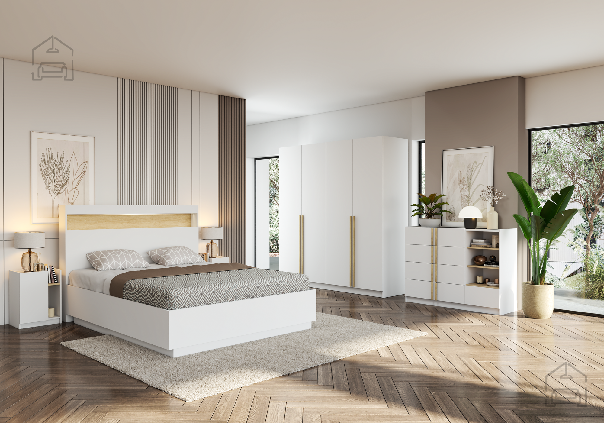 Spalni sestav Sevilla je namenjen vsem, ki želijo ustvariti harmoničen in urejen prostor za počitek. Njena zasnova omogoča enostavno kombiniranje z različnimi dodatki in barvnimi shemami, zato se odlično poda tako v klasično kot v sodobno opremljene spalnice. Gladke površine in preproste linije prispevajo k minimalističnemu videzu, medtem ko kontrast med belo osnovo in hrastovimi vložki prinaša ravno pravo mero topline.
