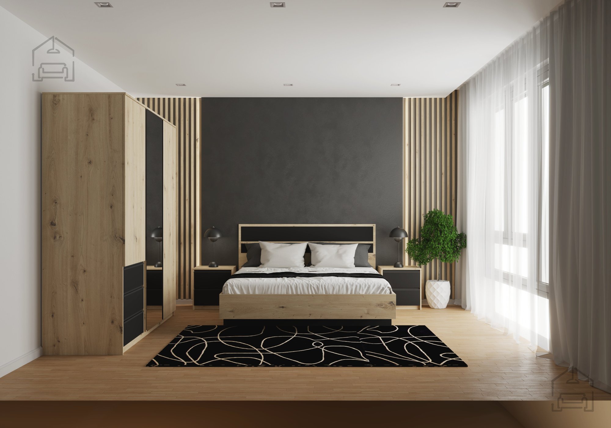 Spalnica Aura prinaša popolno ravnovesje med sodobnim dizajnom in funkcionalnostjo. Kombinacija laminirane plošče v barvi artisan hrasta ter črnih poudarkov ustvarja prijetno, domačo atmosfero, ki hkrati deluje sodobno in prefinjeno. Takšna barvna kombinacija je priljubljena izbira za tiste, ki želijo v svojo spalnico vnesti toplino naravnega lesa, obenem pa ohraniti minimalističen videz s kontrastnimi detajli. Izdelana je v priznanem poljskem podjetju Idżczak Meble, kjer so kakovostna obdelava, natančni detajli in trajnostni materiali vedno v ospredju.