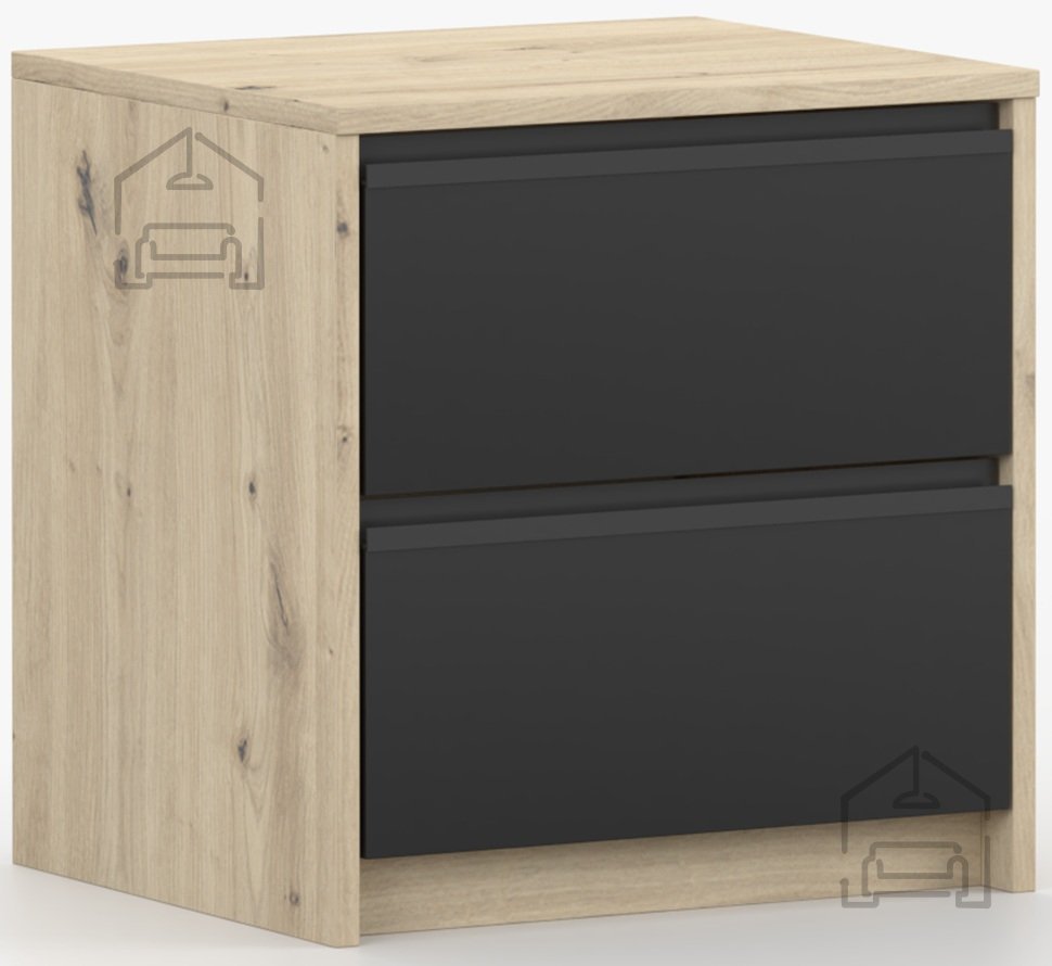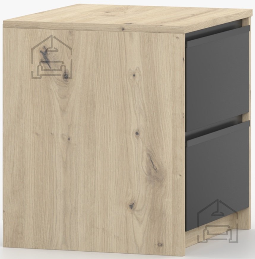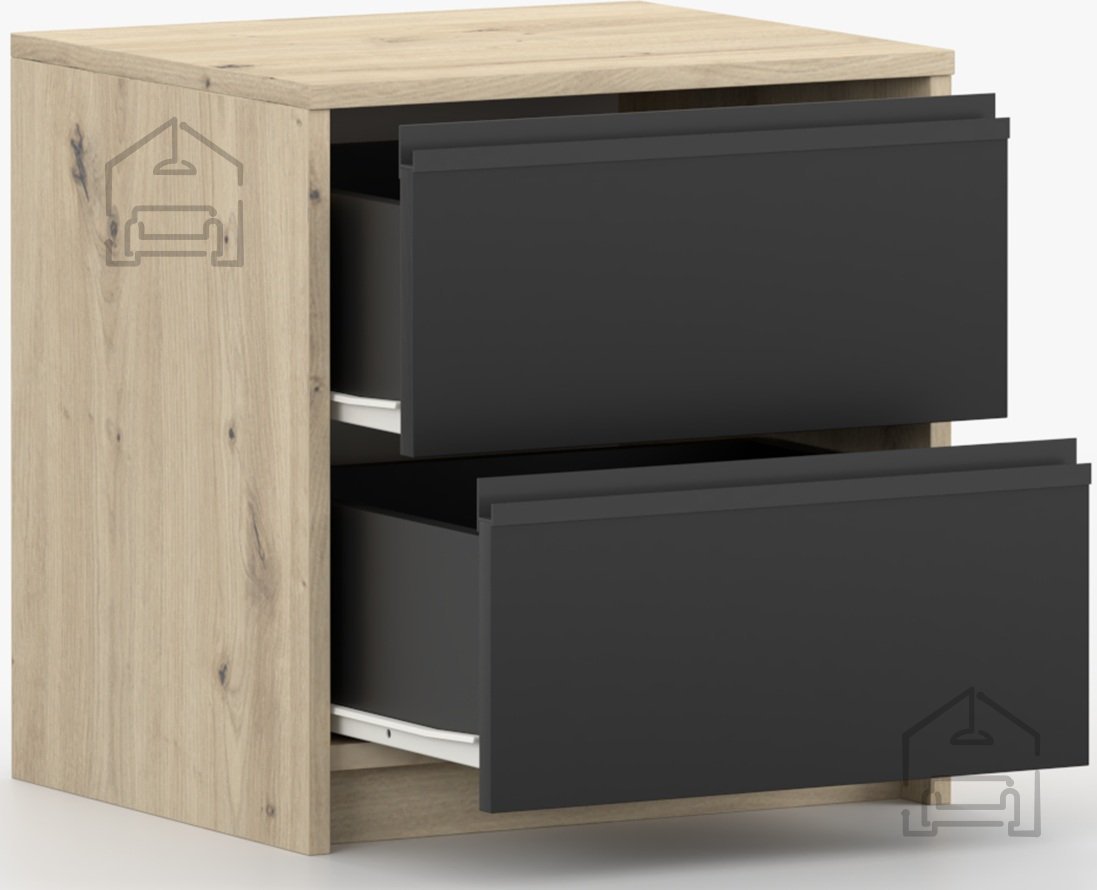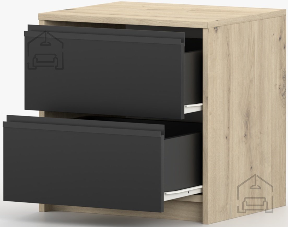 Nočna omarica Aura je kompaktna in funkcionalna rešitev za spalnice, ki iščejo toplino naravnega videza lesa in sodobno eleganco črne barve. Izdelana je iz kakovostne laminirane plošče, kar zagotavlja trpežnost in enostavno vzdrževanje površine. Z dimenzijami 40x42x46 cm se popolnoma prilega manjšim prostorom, hkrati pa ponuja dovolj prostora za shranjevanje vseh nujnih predmetov ob postelji. Izdelek je zasnovan in izdelan v tovarni Idžczak Meble na Poljskem, znani po dosledni kakovosti in natančni obdelavi detajlov.