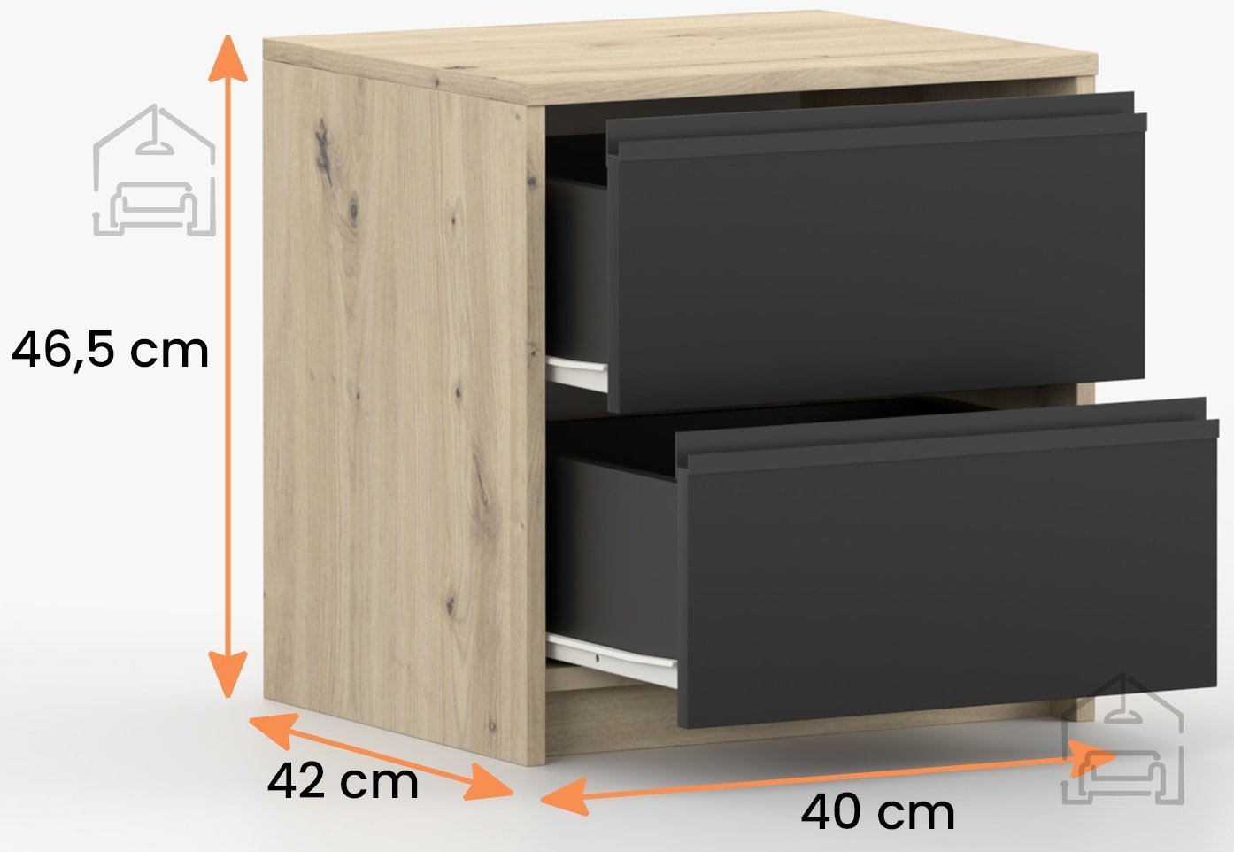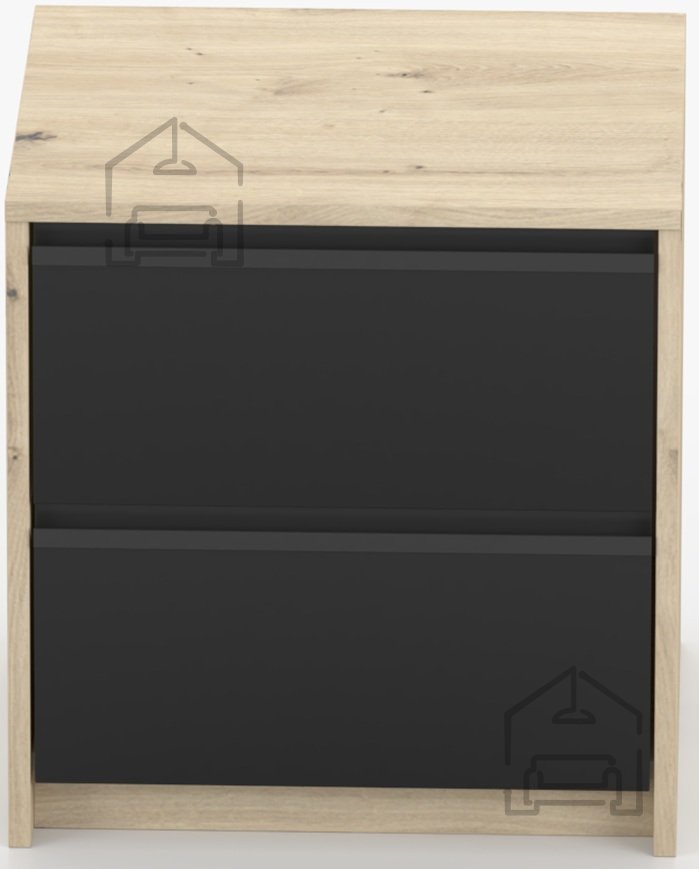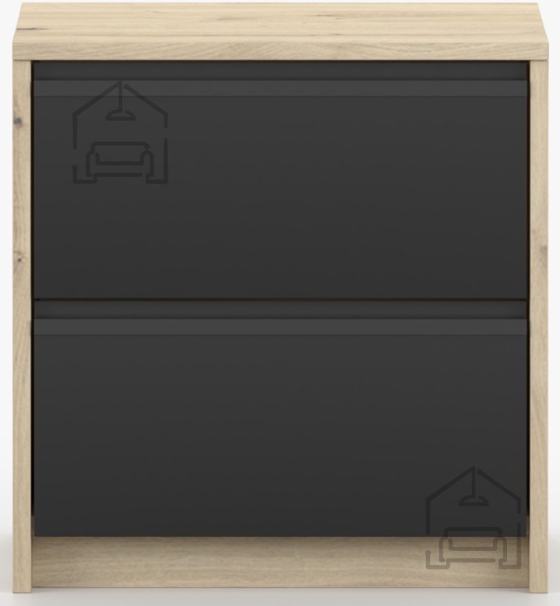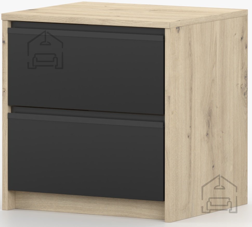 Nočna omarica Aura je kompaktna in funkcionalna rešitev za spalnice, ki iščejo toplino naravnega videza lesa in sodobno eleganco črne barve. Izdelana je iz kakovostne laminirane plošče, kar zagotavlja trpežnost in enostavno vzdrževanje površine. Z dimenzijami 40x42x46 cm se popolnoma prilega manjšim prostorom, hkrati pa ponuja dovolj prostora za shranjevanje vseh nujnih predmetov ob postelji. Izdelek je zasnovan in izdelan v tovarni Idžczak Meble na Poljskem, znani po dosledni kakovosti in natančni obdelavi detajlov.