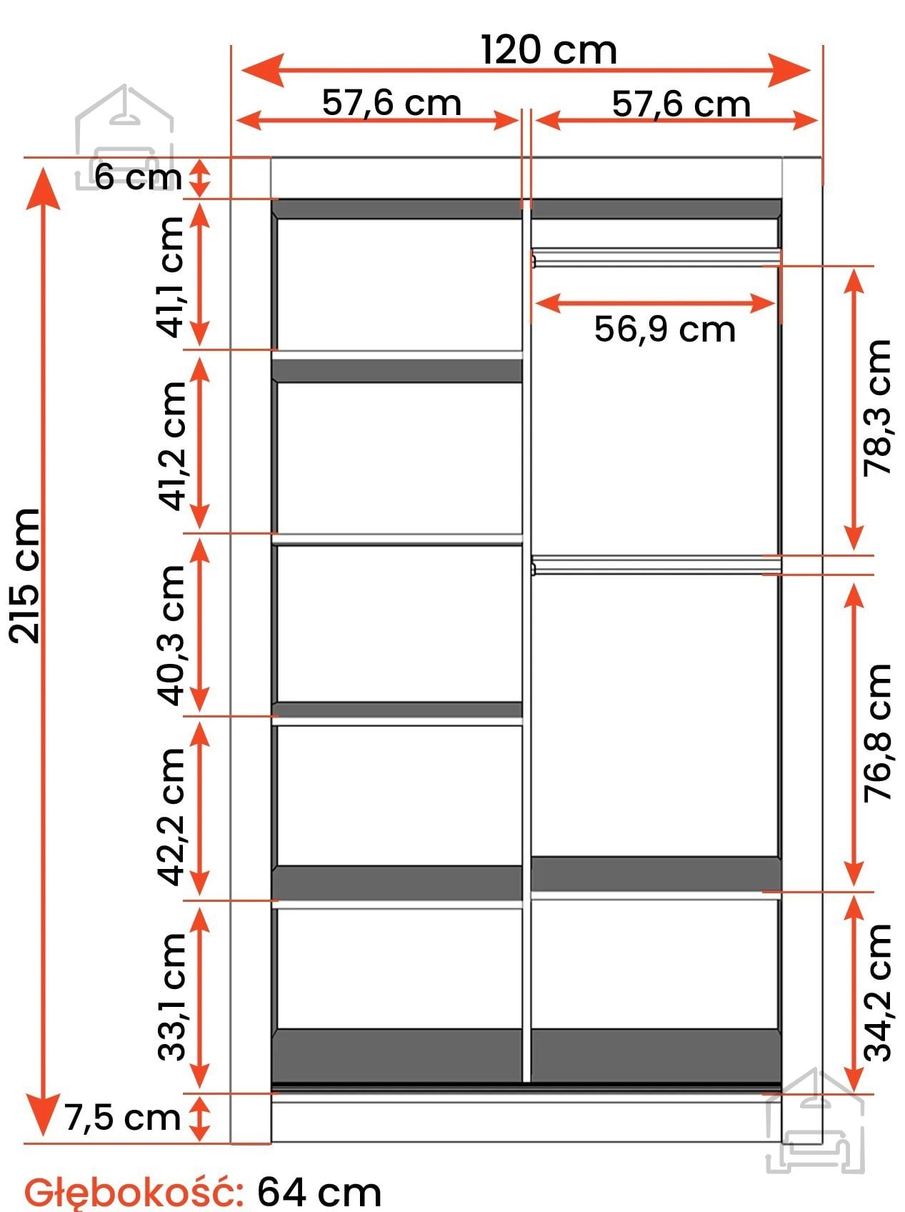 Notranjost garderobne omare Milan je zasnovana premišljeno, tako da omogoča pregledno shranjevanje različnih vrst oblačil. Ena stran običajno vključuje obešalno palico za plašče, jakne in srajce, druga pa police za zložene kose, kot so majice, puloverji ali posteljnina. Takšna razporeditev omogoča raznoliko uporabo in učinkovito organizacijo prostora. Na dno omare lahko postavite škatle za sezonsko obutev ali dodatke, kot so torbe in pasovi.