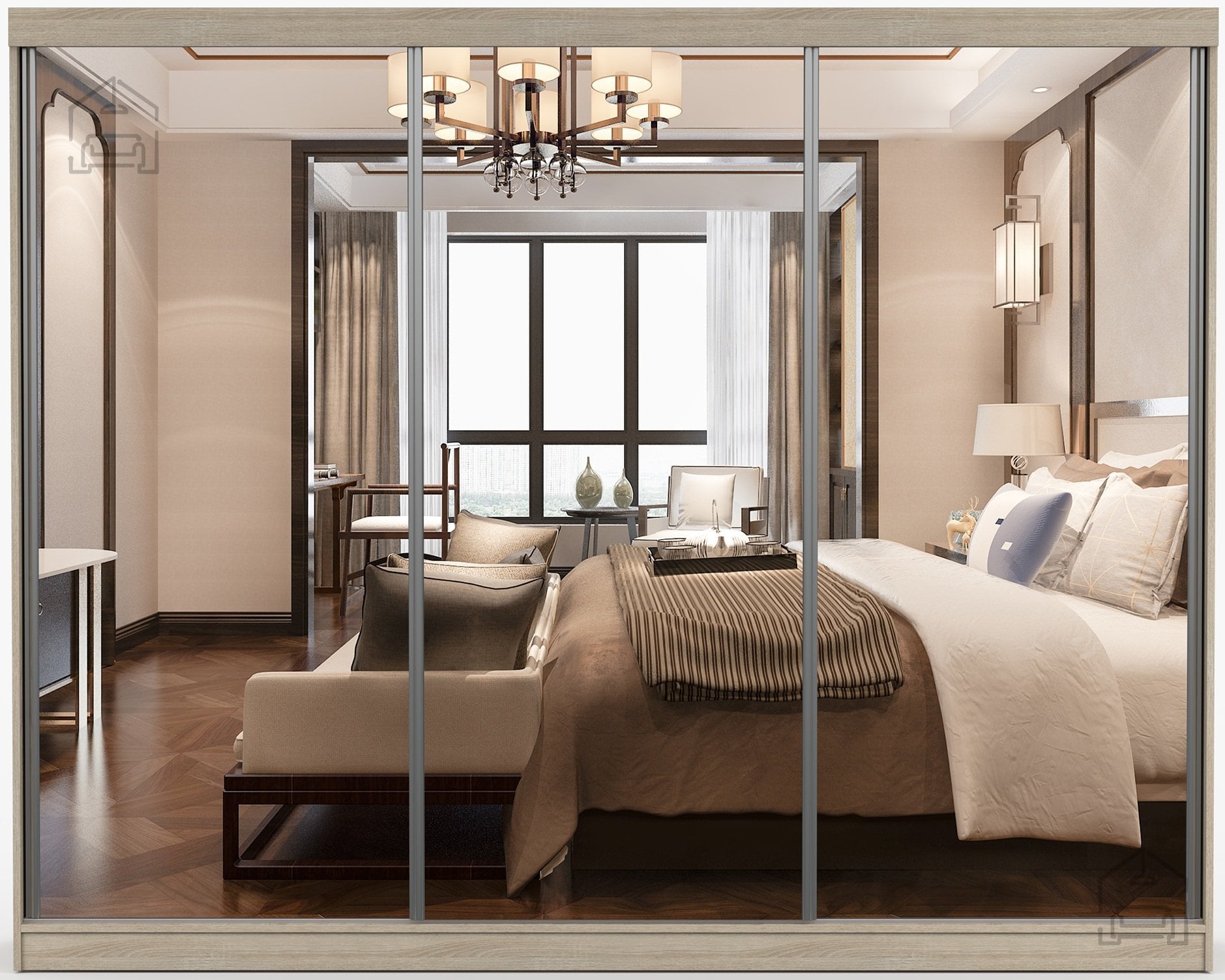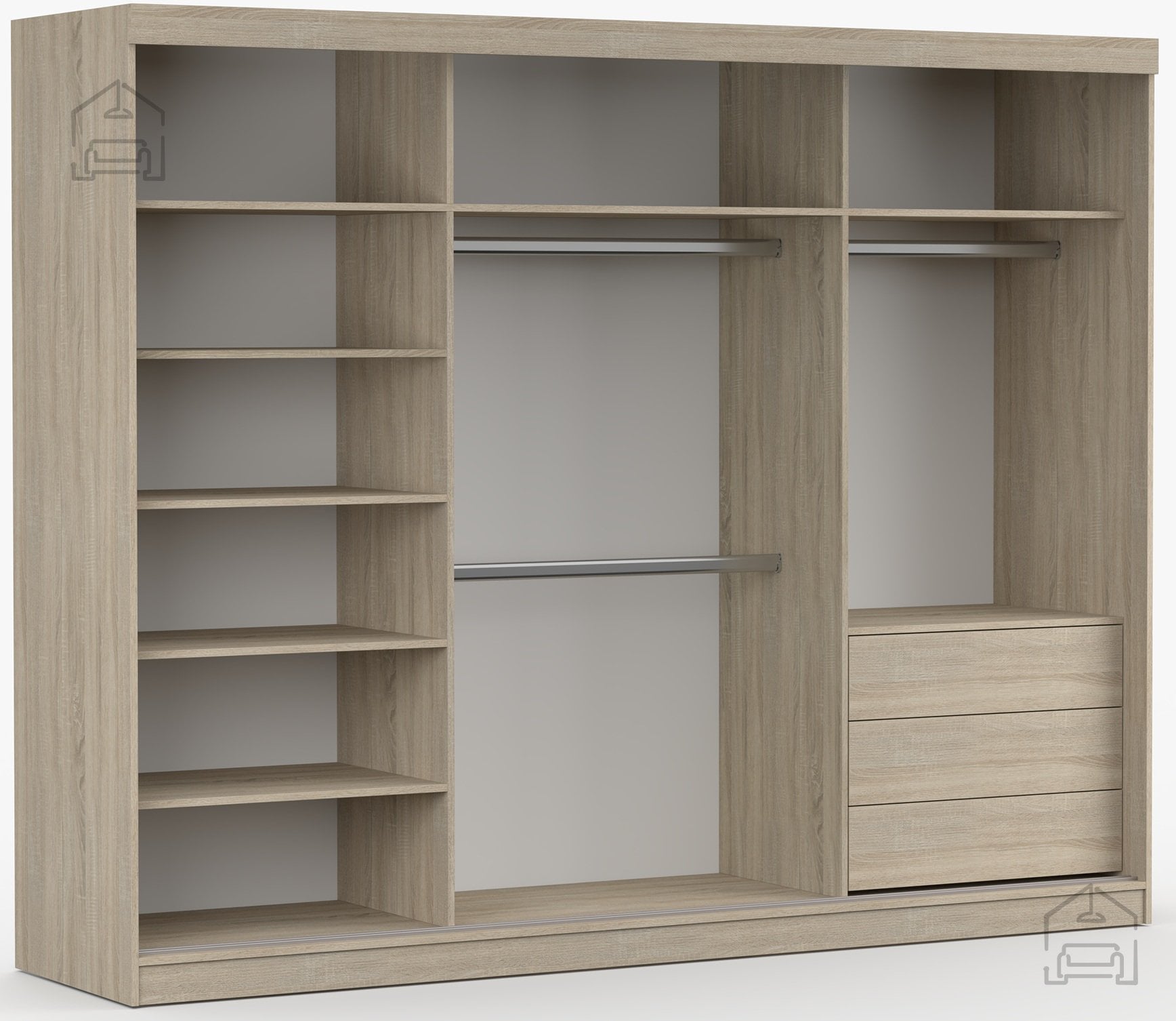Drsna vrata so eden ključnih elementov te garderobne omare. Omogočajo enostaven dostop do notranjosti, ne da bi bilo treba skrbeti za prostor, ki ga običajno zahtevajo klasična krilna vrata. Mehanizem drsnih vrat deluje gladko in zanesljivo, kar zagotavlja tiho in udobno uporabo. Takšna zasnova je kot nalašč za spalnice, predsobe ali garsonjere, kjer je vsak centimeter prostora dragocen.