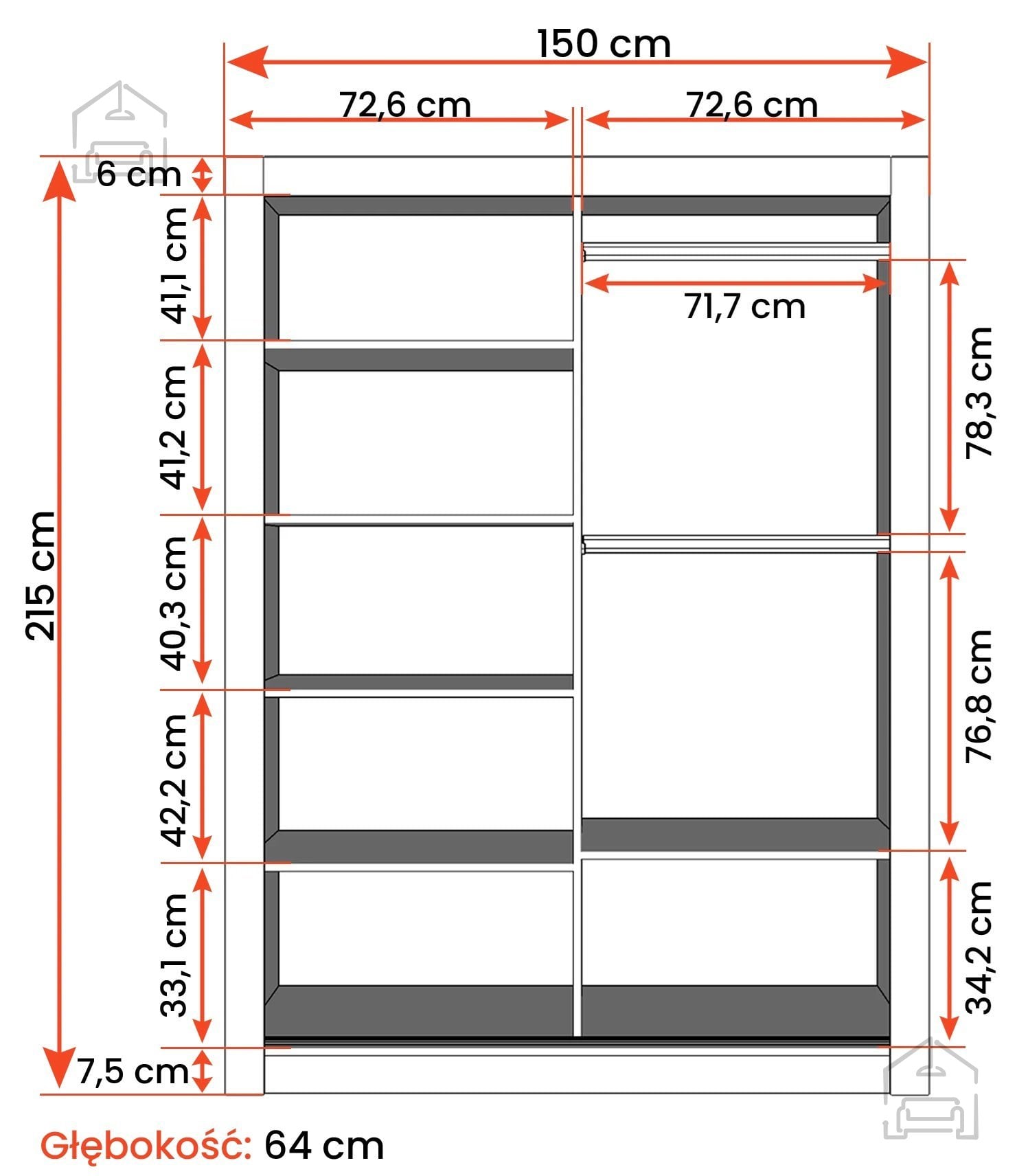 Notranja razporeditev garderobne omare Venice je zasnovana z mislijo na preglednost in uporabnost. Drsna vrata omogočajo enostaven dostop do vsebine, ne da bi bilo treba dodatno odpirati vrata navzven – kar je idealno za manjše prostore. V notranjosti se običajno nahajajo prostorni deli za obešanje oblačil na palico ter police za zložene kose garderobe. Takšna razporeditev pomaga ohranjati red in omogoča hitro izbiro oblačil vsako jutro.