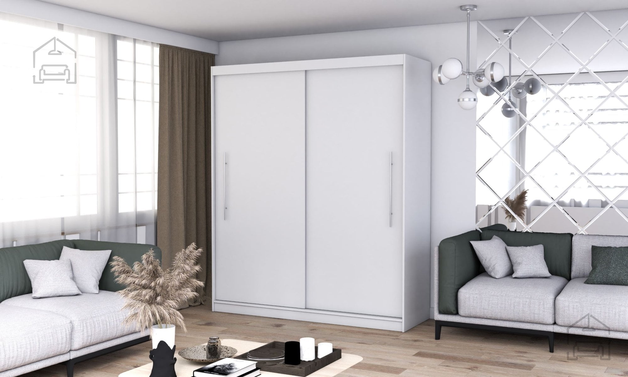 Omara Torino ima dvoje drsnih vrat, ki omogočata preprost dostop do notranjosti brez potrebe po dodatnem prostoru za odpiranje. Ta rešitev je še posebej praktična v manjših sobah ali ozkih hodnikih. Zunanjost omare je oblikovana z mislijo na preprostost in eleganco – bela barva ustvarja nevtralno osnovo, ki se ujame z različnimi barvnimi toni sten, talnih oblog in preostalega pohištva.