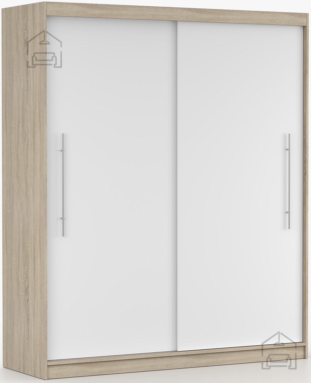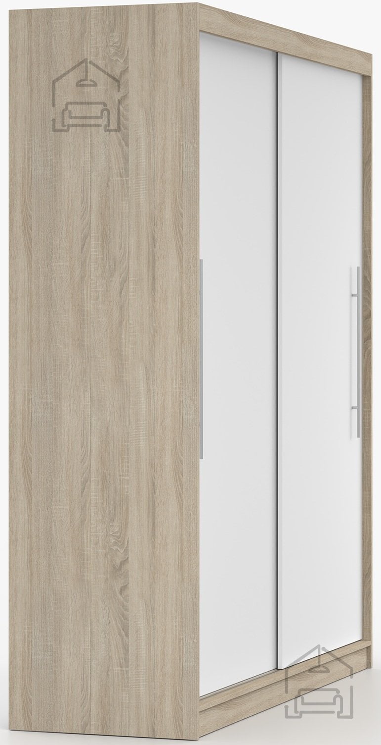 Garderobna omara z drsnimi vrati Torino združuje sodoben dizajn in praktično razporeditev prostora. Narejena je iz kakovostne laminirane plošče, ki zagotavlja trpežnost, enostavno vzdrževanje ter odpornost na vsakodnevno uporabo. Elegantna barvna kombinacija sonoma hrasta in bele površine v prostor vnese občutek svetlobe, topline in urejenosti. Ta omara je idealna izbira za spalnico, predsobo ali garderobni prostor, kjer je pomembna organizacija in estetski videz.