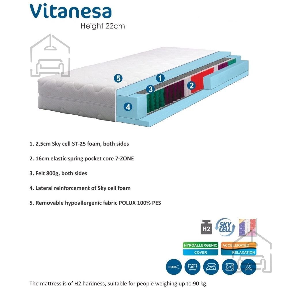 Vzmetnica Vitanesa je razvrščena v stopnjo trdote H2, kar pomeni srednjo mehkobo. Takšna trdota je primerna za uporabnike, ki želijo mehkejši občutek ležišča, vendar brez izgube podpore. Zasnova omogoča optimalno prileganje telesu, kar zmanjšuje napetost v mišicah in sklepih. S kombinacijo pene SKY CELL in žepkastih vzmeti vzmetnica ohranja ravnovesje med udobjem in stabilnostjo po celotni površini.