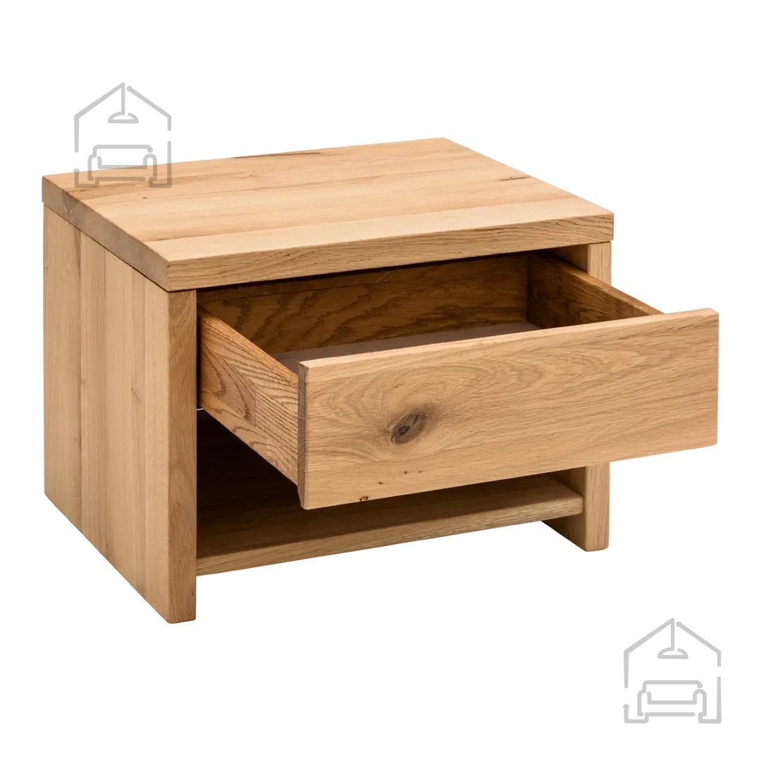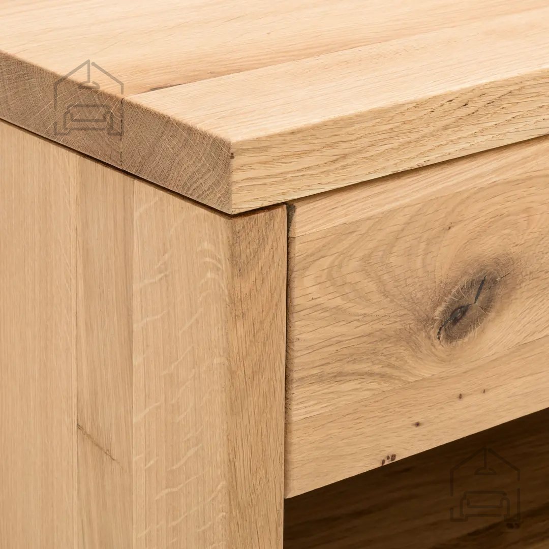 Nočna omarica Regina združuje brezčasno eleganco naravnega lesa in praktično funkcionalnost v kompaktnem formatu, idealnem za sodobne spalnice. Izdelana je iz masivnega hrastovega lesa, ki je znan po svoji trpežnosti, stabilnosti in naravni lepoti. Površina je naoljena, kar poudari značilno teksturo lesa in zagotavlja dodatno zaščito pred vsakodnevnimi vplivi. S svojimi dimenzijami 50×40×42,5 cm se popolnoma prilega ob posteljo, ne da bi zavzela preveč prostora, hkrati pa ponuja dovolj uporabne površine in shranjevalnega prostora.