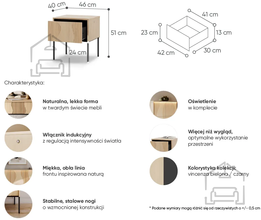 Poseben značaj pohištva ustvarja barvna zasnova v odtenkih beljenega hrasta Vincenza in črne barve. Ta kontrast prinaša občutek topline lesa in sodobne elegance, zaradi česar se omarica lepo ujema z različnimi pohištvenimi elementi – od klasičnih lesenih postelj do minimalističnih modernih zasnov.