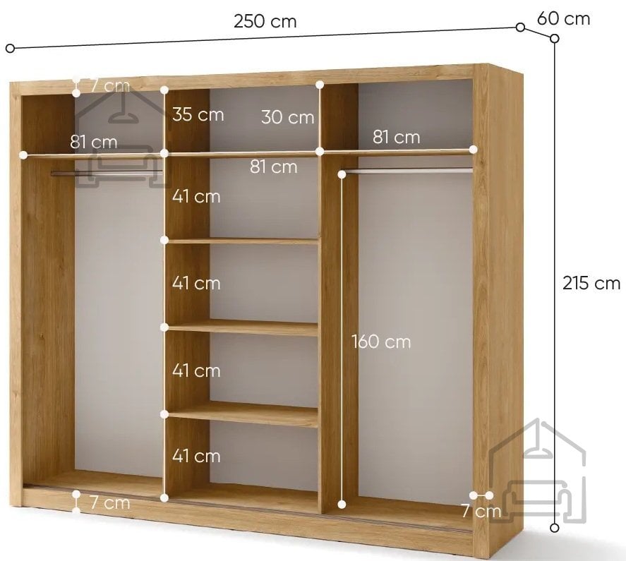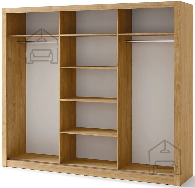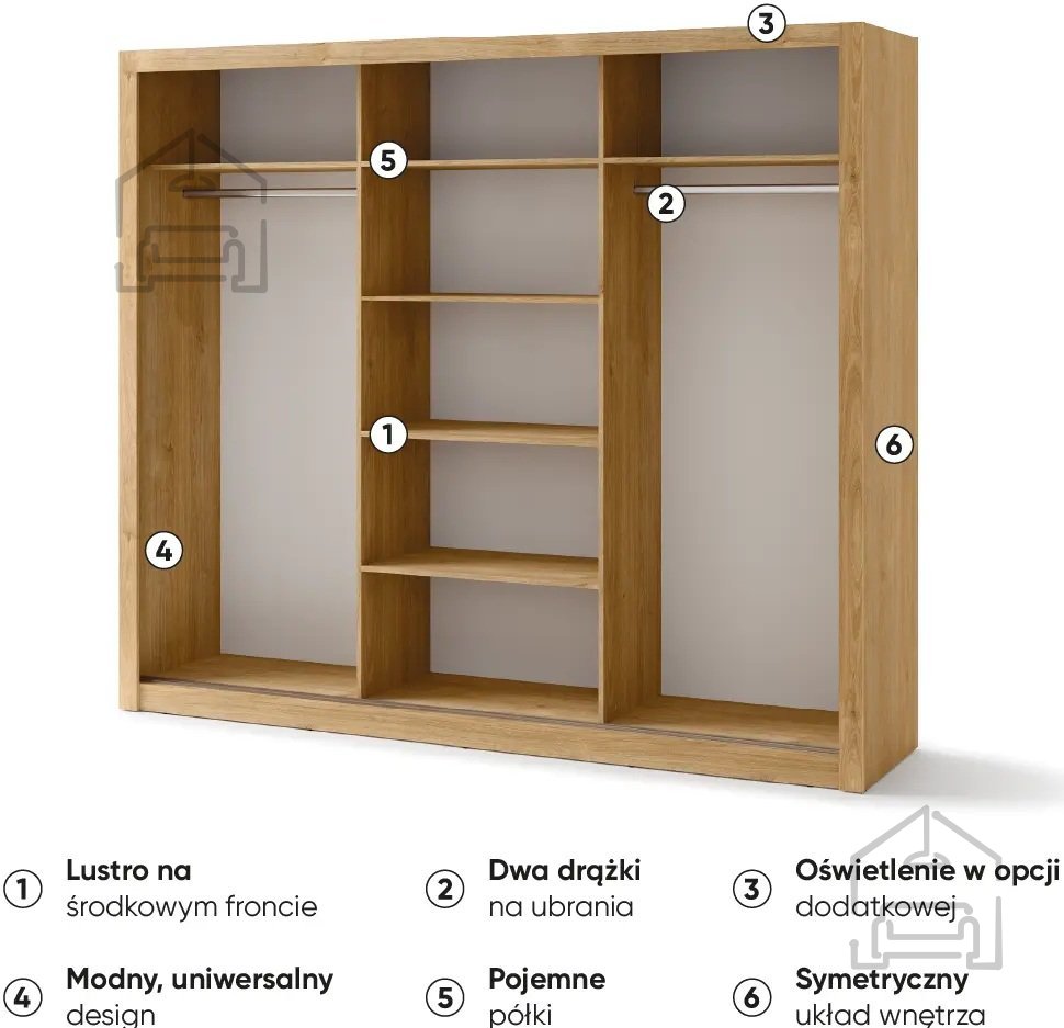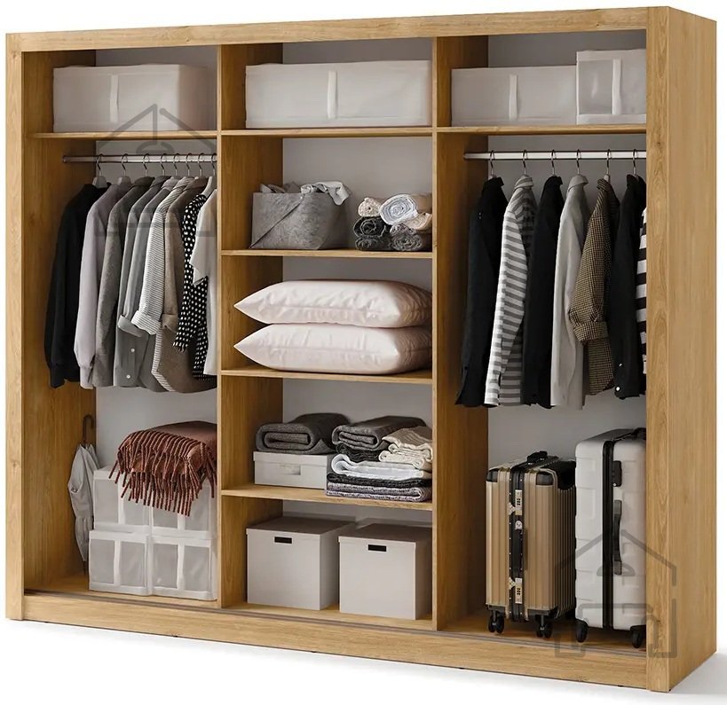 Notranjost omare je zasnovana tako, da omogoča kar najbolj pregledno in praktično razporeditev oblačil. Vključuje dva drsnika za obešalnike ter notranji regal z več prostornimi policami. Na zgornjih policah je dovolj prostora za sezonska oblačila, škatle ali potovalne torbe, medtem ko spodnji del nudi udoben dostop do vsakodnevno uporabljenih kosov garderobe. Takšna simetrična razporeditev omogoča, da si prostor v omari enakovredno delita dve osebi – idealna rešitev za partnersko spalnico.