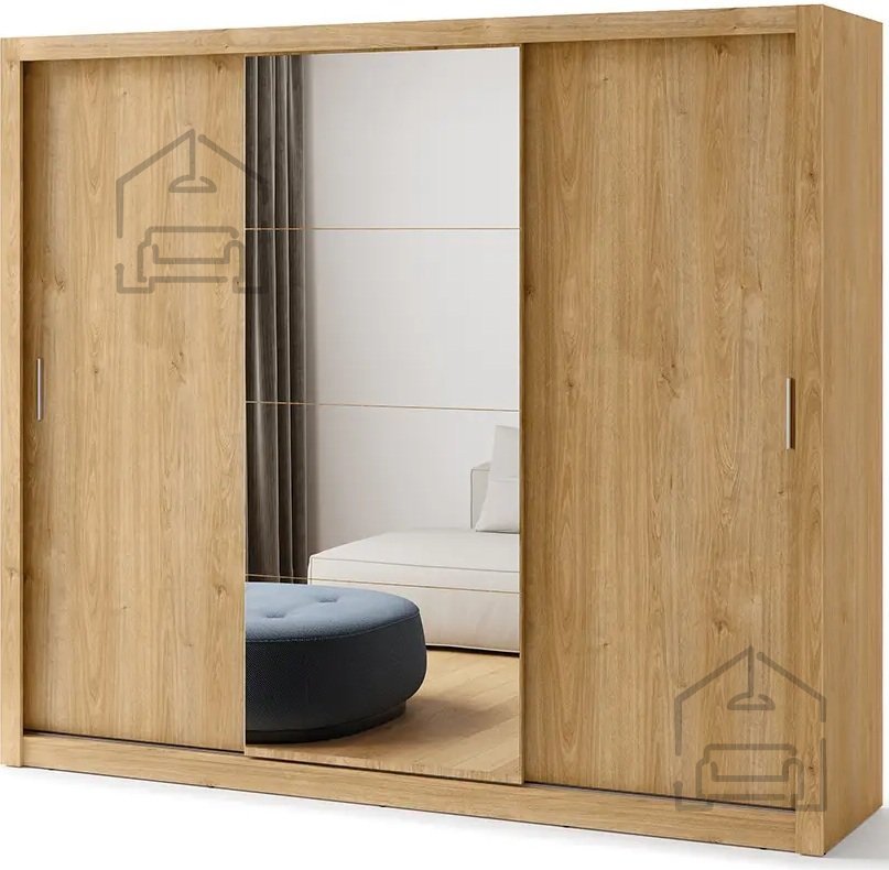Osrednji del omare krasi veliko ogledalo, ki ima dvojno funkcijo – vizualno poveča prostor in ga naredi svetlejšega, hkrati pa olajša vsakodnevno izbiro oblačil. Takšen detajl še dodatno poudari sodobno zasnovo in prinaša praktično vrednost. Hrast shetland barva omare poskrbi za svež in urejen videz prostora ter se zlahka kombinira z različnimi barvnimi toni sten in tekstila.