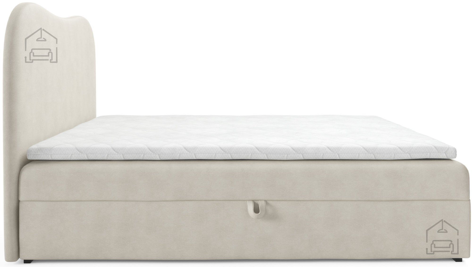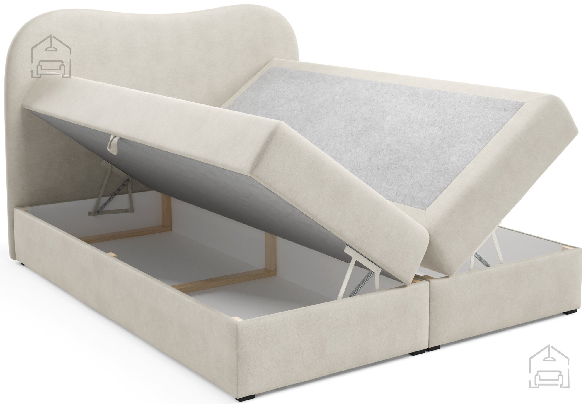 Ena izmed ključnih prednosti boxspring postelje Ambra Lux je njen dvižni mehanizem s pomočjo vzmeti, ki omogoča enostavno dvigovanje ležalnega dela. Ta sistem razkrije dva prostorna predala za posteljnino, v katerih lahko shranjujete odeje, vzglavnike ali sezonsko posteljnino. Dvigovanje je zaradi vzmetne pomoči lahkotno in ne zahteva posebne moči. Podnožje je zasnovano brez klasičnih nogic – namesto njih ima postelja plastične drsnike, ki omogočajo stabilno postavitev ter hkrati ščitijo tla pred praskami.