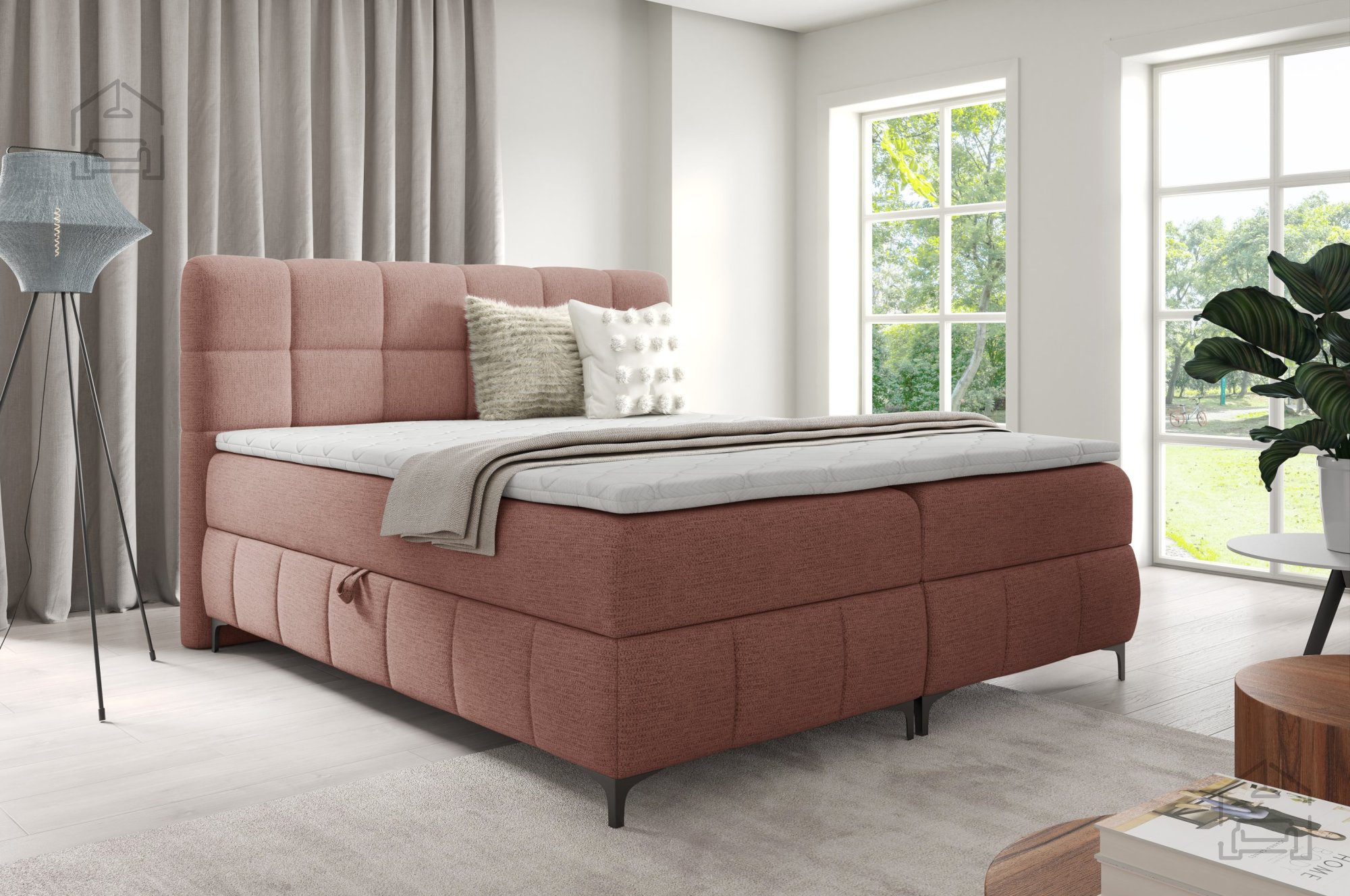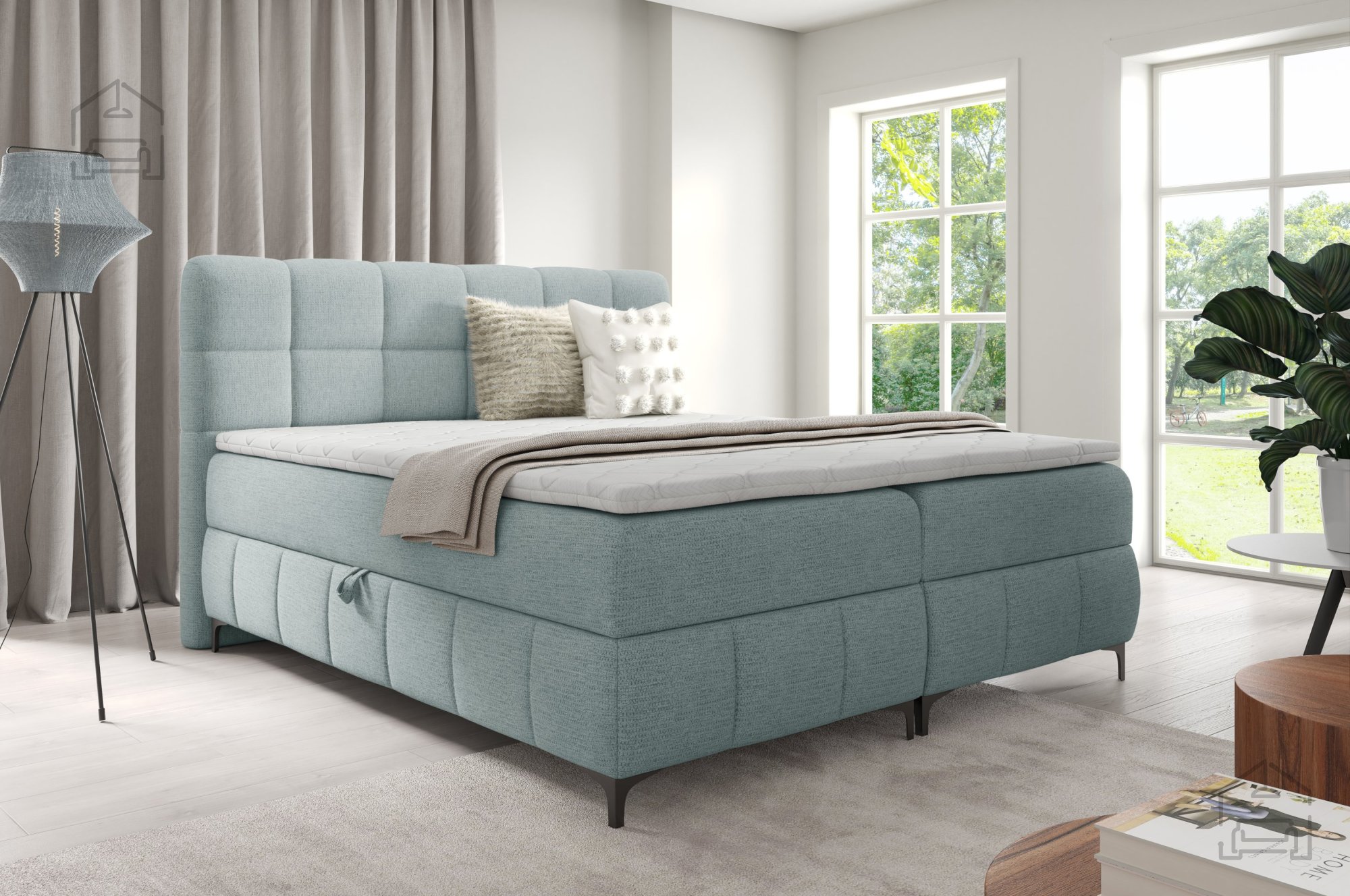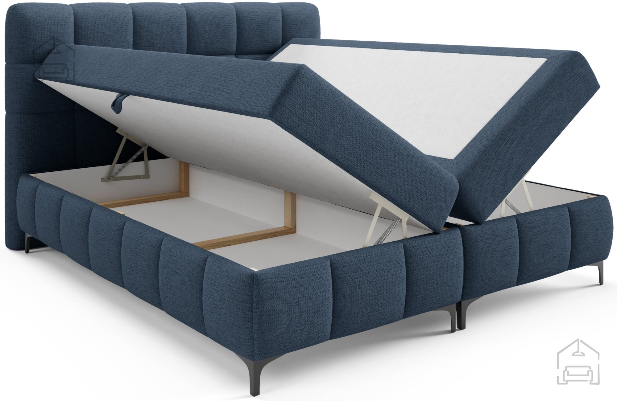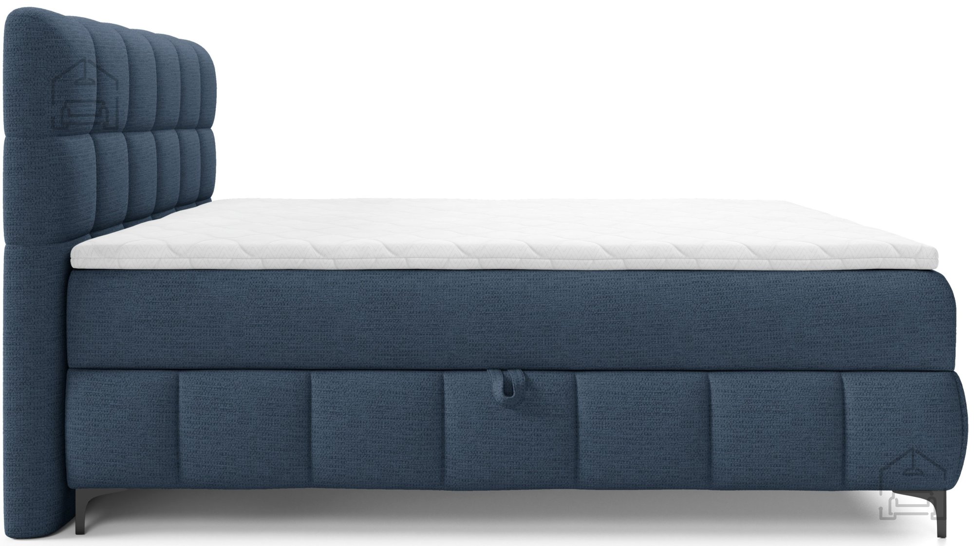 Boxspring postelja Sophie je na voljo v več barvah, kar omogoča, da jo enostavno uskladite z obstoječim pohištvom in dekorjem v spalnici. Kovinske črne nogice dvigujejo konstrukcijo nad tlemi, kar olajša čiščenje in daje postelji vizualno lahkotnost. Dekorativni šivi na vzglavju in stranicah poudarjajo kakovost izdelave ter dodajo občutek elegance.