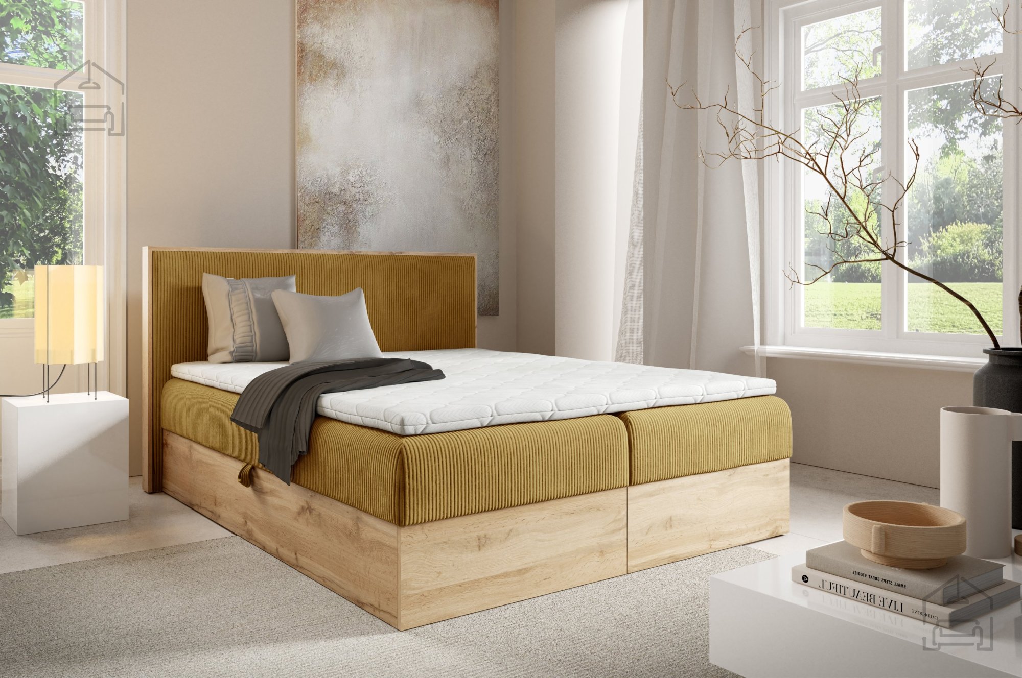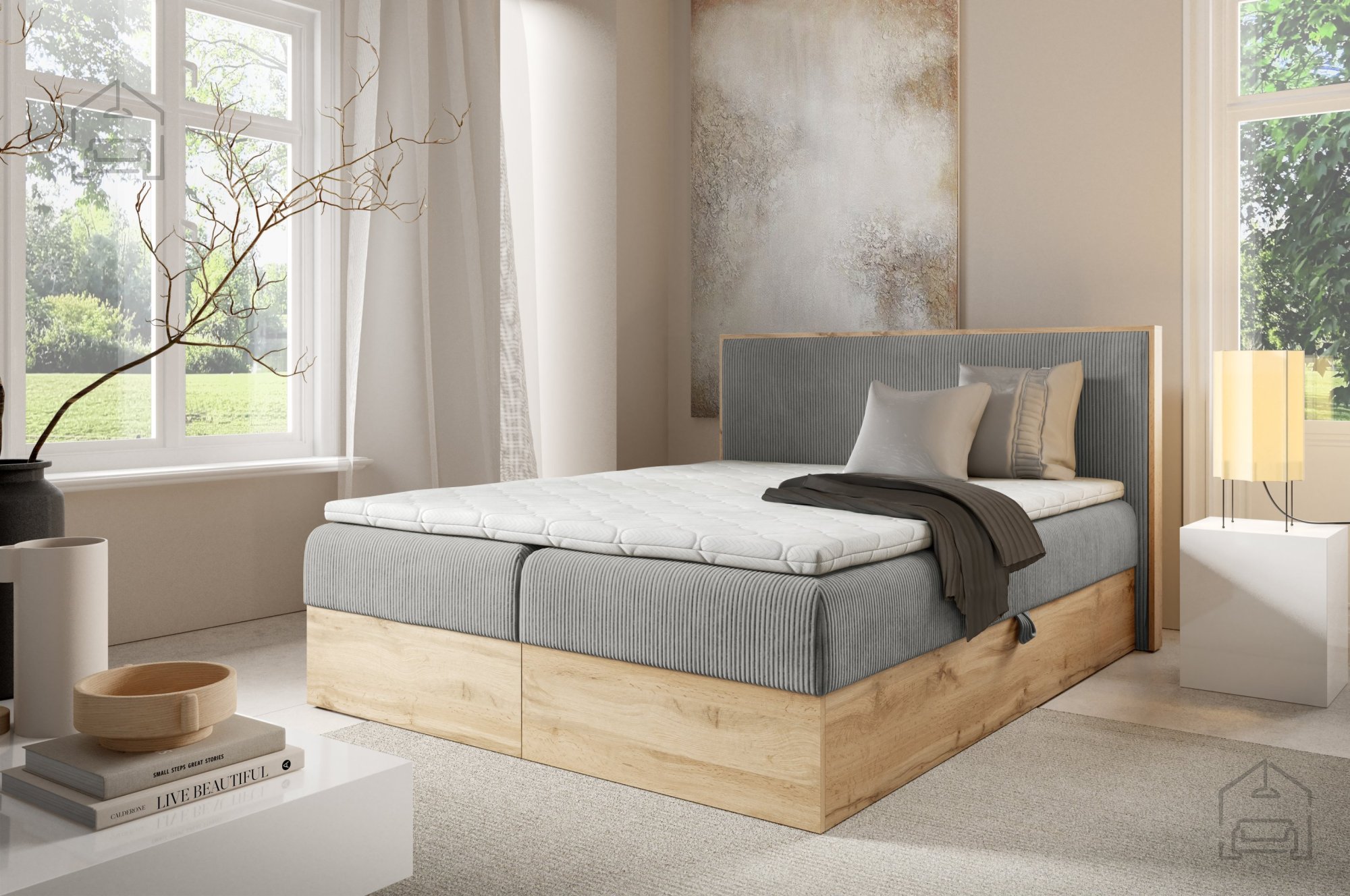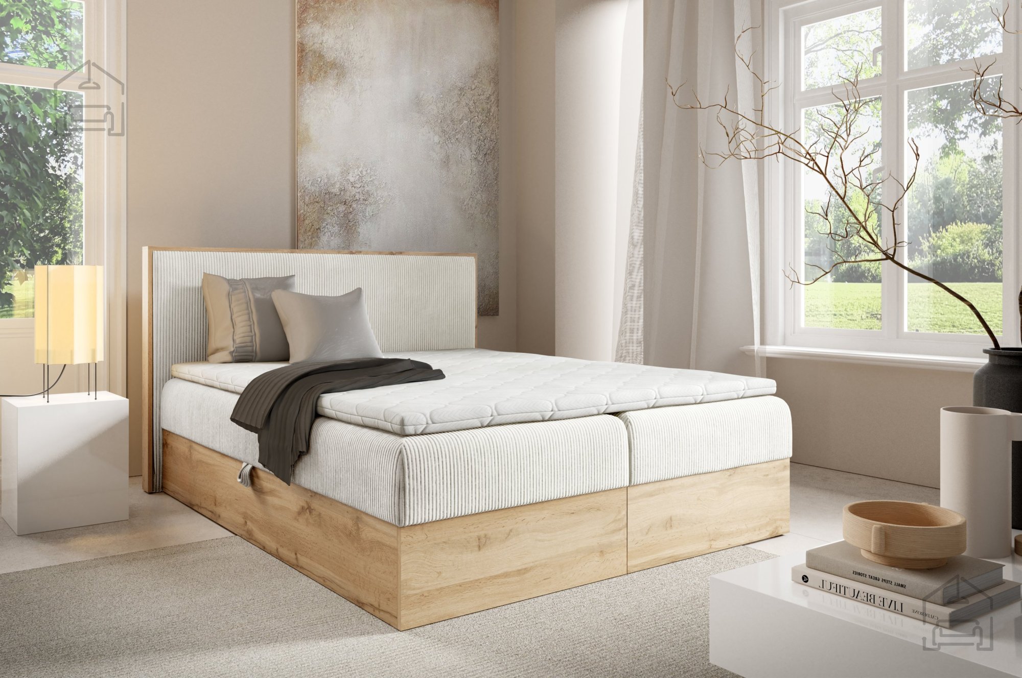 Boxspring postelja Wood 11 znamke Meble Gruška je zasnovana za tiste, ki iščejo funkcionalnost in udobje v enem. Njen dvižni mehanizem omogoča enostaven dostop do prostornega predala za posteljnino, medtem ko kakovostni materiali, kot so iveral, tkanina in pena T-25, zagotavljajo trdnost, stabilnost in prijeten občutek pri vsakodnevni uporabi. Sodobna zasnova v kombinaciji z vzorcem tkanine Lincoln 52 in dekorjem sonoma hrast ustvarja harmoničen videz, ki se lepo poda v različne spalniške ambiente.