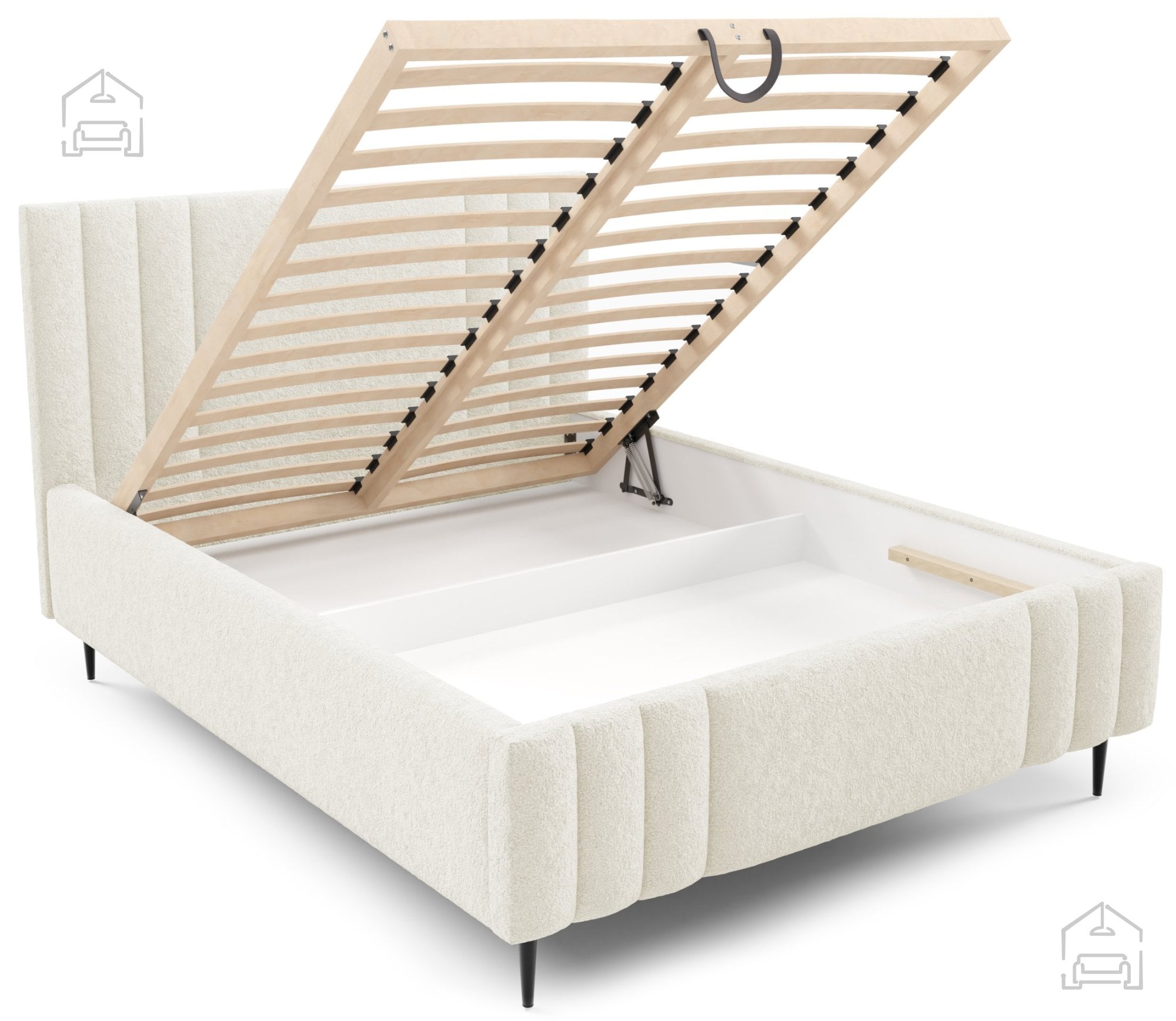Ena od pomembnih prednosti tega modela je dvižni mehanizem z vzmetnim odpiranjem, ki omogoča lahek dostop do prostornega predala za posteljnino. Ta del je posebej uporaben v manjših stanovanjih ali spalnicah, kjer je vsak dodaten prostor za shranjevanje dobrodošel. Mehanizem je zasnovan tako, da je odpiranje preprosto in varno, brez večjega napora. Predal je dovolj velik za shranjevanje odej, blazin ali sezonskih oblačil, kar pomaga ohranjati urejenost prostora.