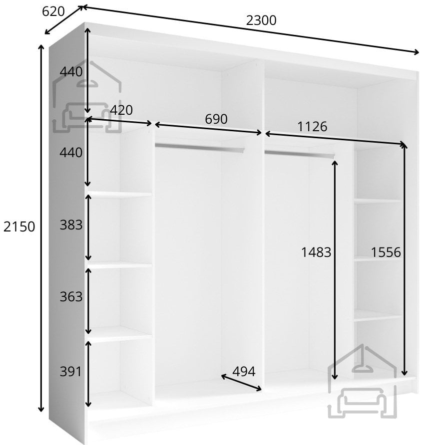 Omara Fino je zasnovana z mislijo na pregledno in učinkovito organizacijo oblačil. V notranjosti je dovolj prostora za obešalnike, police in druge rešitve za shranjevanje, ki omogočajo razporeditev garderobe po vaših željah. Zaradi svoje prostornosti je primerna tako za posameznike kot za pare ali družine. Zrcalne površine pa omogočajo, da se oblačite in preverjate svoj videz, ne da bi potrebovali dodatno stoječe ogledalo.