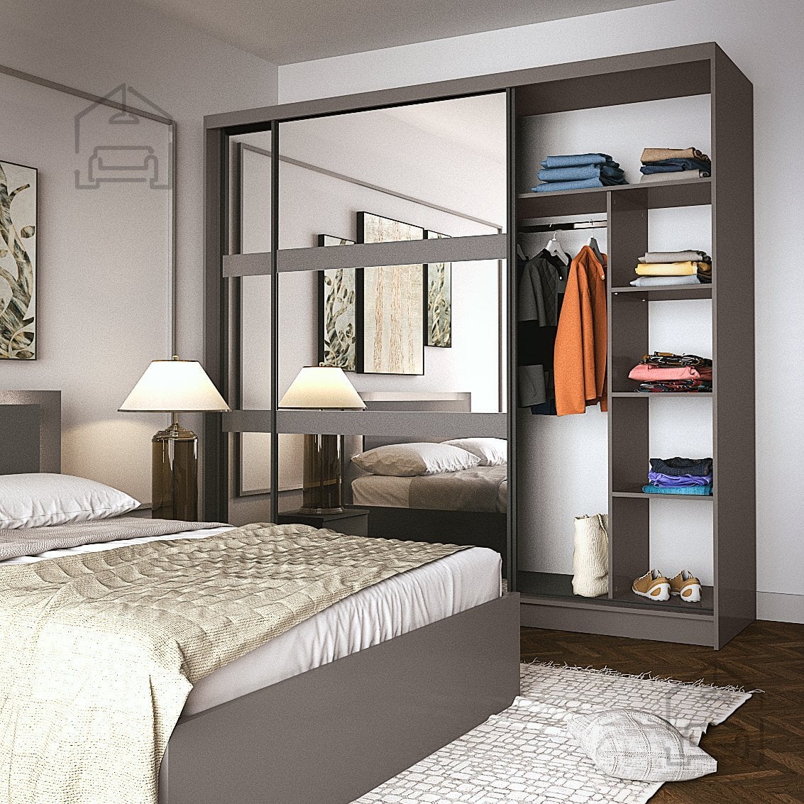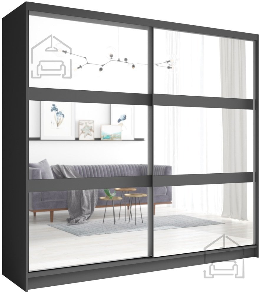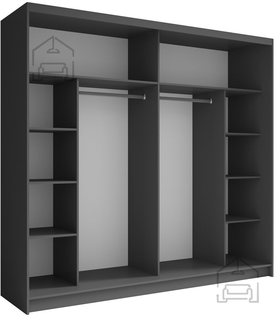 Grafitna barva garderobne omare Fino prinaša v prostor občutek svežine, čistoče in vizualne prostornosti. Nevtralna barvna zasnova omogoča enostavno kombiniranje z različnimi stili notranje opreme – od minimalističnega skandinavskega videza do klasične elegance. Aluminijasti ročaji poudarjajo sodoben značaj omare, hkrati pa omogočajo udobno odpiranje drsnih vrat.