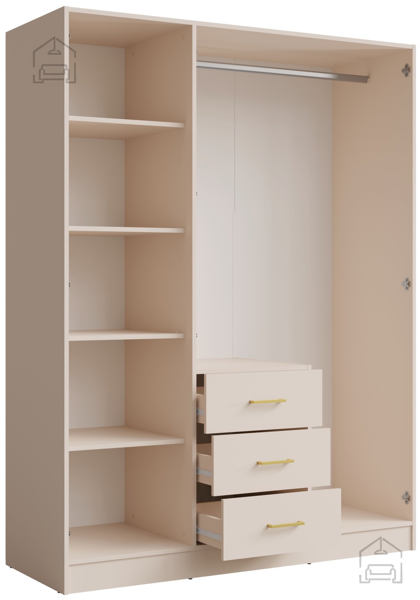 Garderobna omara Konso 19 v bež barvi je del priznane kolekcije Konso, ki prihaja iz poljske tovarne Meblosiek. Ta model s širino 150 cm je zasnovan za tiste, ki iščejo popolno ravnovesje med eleganco, funkcionalnostjo in kakovostjo izdelave. Korpus omare je izdelan iz laminirane iverne plošče debeline 16 mm, kar zagotavlja trdnost, stabilnost in dolgo življenjsko dobo. Bež odtenek se z lahkoto prilagodi različnim slogom notranje opreme, od sodobnih do klasičnih ambientov, ter prostoru doda prijetno toplino in občutek domačnosti.