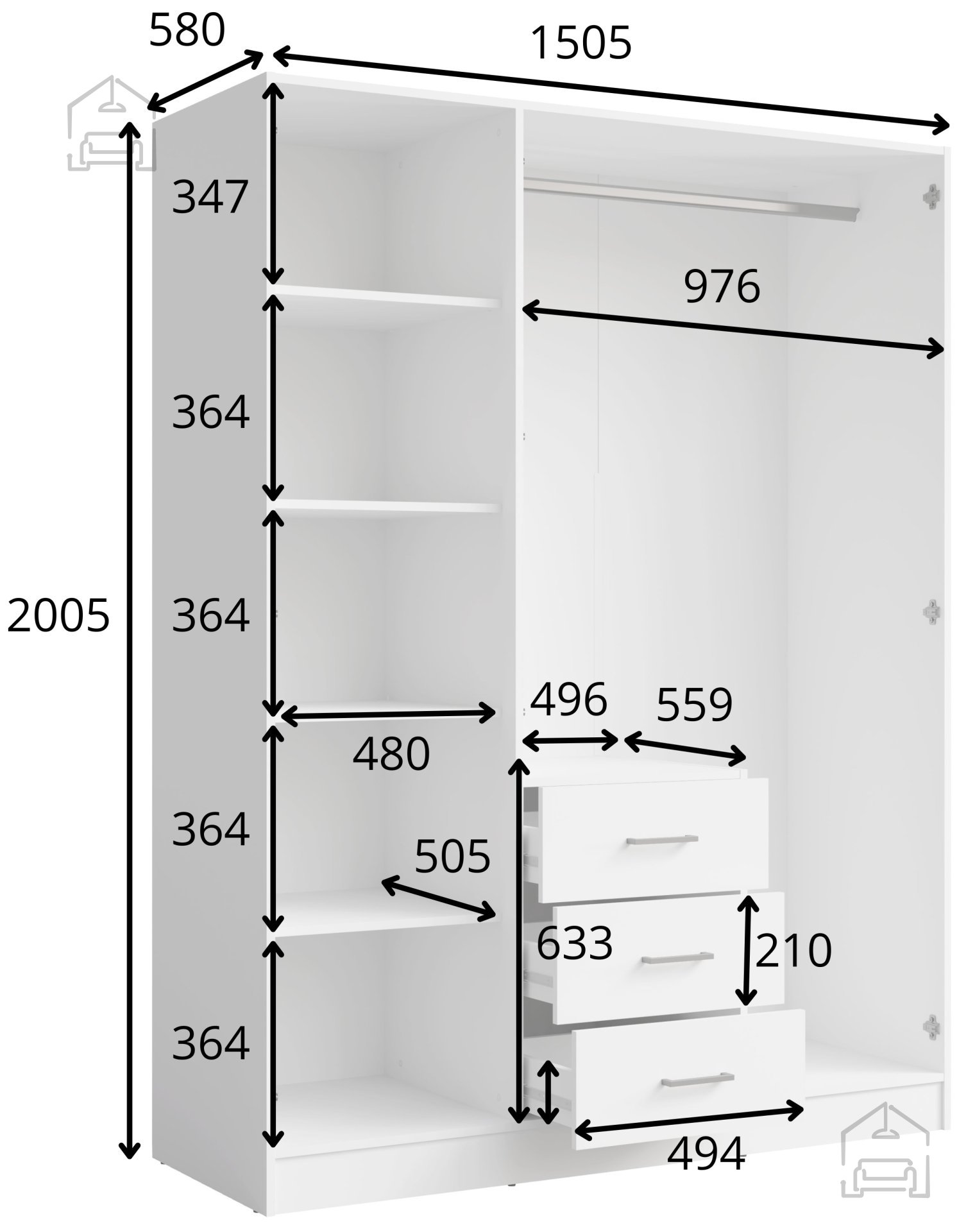 Njena višina 200,5 cm omogoča učinkovito izrabo prostora do stropa, kar je še posebej uporabno v manjših stanovanjih, kjer je vsak centimeter dragocen. Globina 58 cm zagotavlja dovolj prostora za obešanje oblačil brez gubanja, kar je ključno za ohranjanje urejenega videza garderobe.