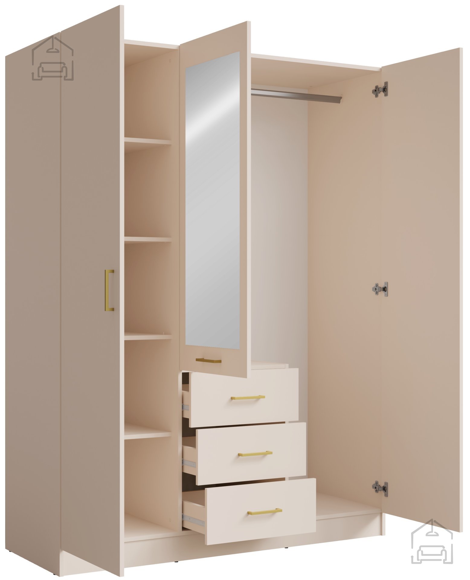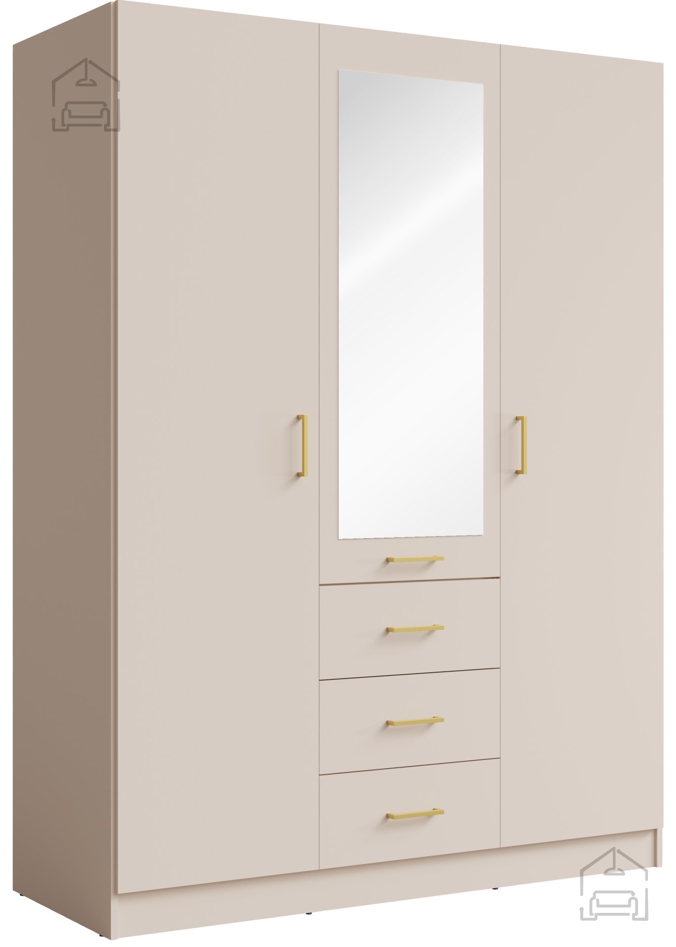 Poseben poudarek kolekcije Konso so zlate ročaje, ki dodajo pridih razkošja in dopolnijo sicer umirjeno barvno shemo. Takšna kombinacija subtilne barve in kovinskega detajla ustvarja harmonijo med sodobnim in klasičnim slogom, kar omogoča, da se omara brez težav zlije z različnimi notranjimi ambienti.