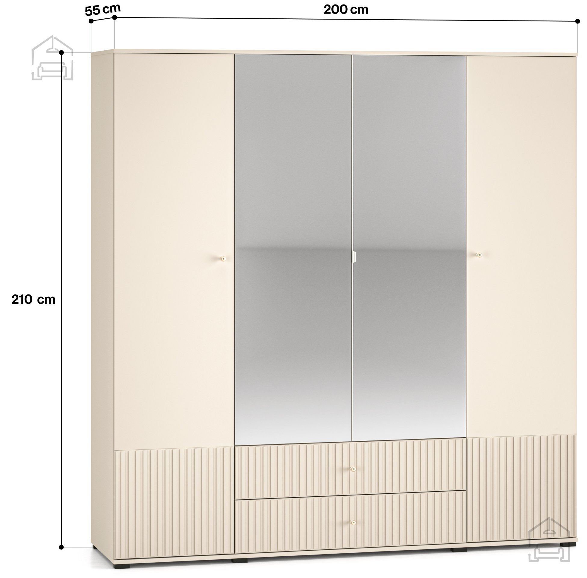 V notranjosti se skriva popolna organizacija prostora za vaša oblačila, dodatke in obutev. Omara s štirimi vrati in dvema prostornima predaloma omogoča jasno razdelitev med visečim in zložljivim delom garderobe. Police so razporejene tako, da lahko učinkovito izkoristite vsak centimeter prostora, hkrati pa ohranite preglednost. Viseči del ponuja dovolj prostora za dolga oblačila, medtem ko so predali idealni za manjše kose, kot so spodnje perilo, šali ali pasovi. Takšna razporeditev zagotavlja, da imate vse, kar potrebujete, vedno pri roki in lepo pospravljeno.