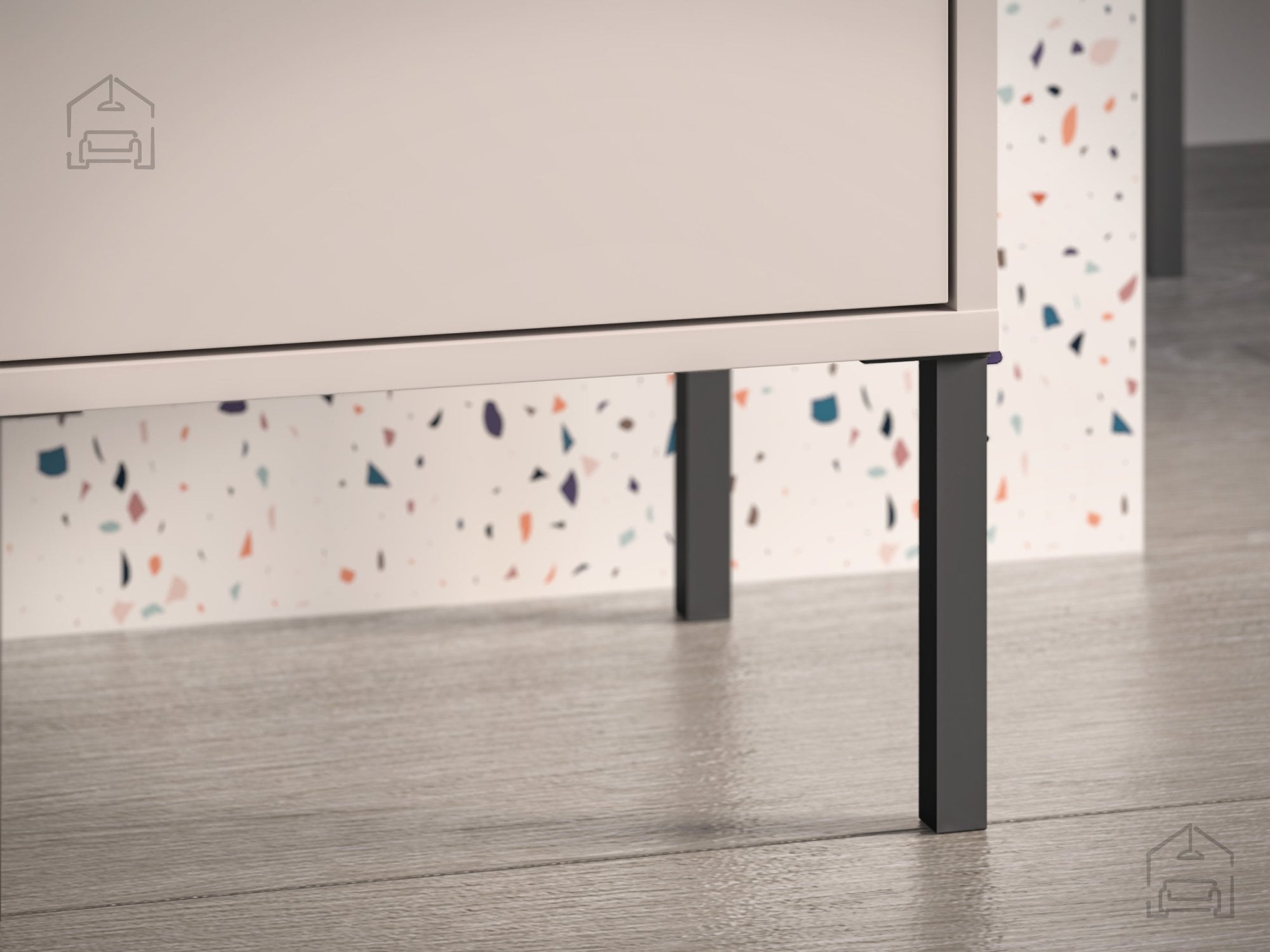 Kovinski okvir in visoke noge so oblikovani tako, da omogočajo enostavno čiščenje tal pod omarico in prispevajo k stabilnosti celotne konstrukcije. Višina nog optično poveča prostor in daje kosu pohištva lahkotnejši, bolj zračen videz, kar je značilno za sodoben interier.