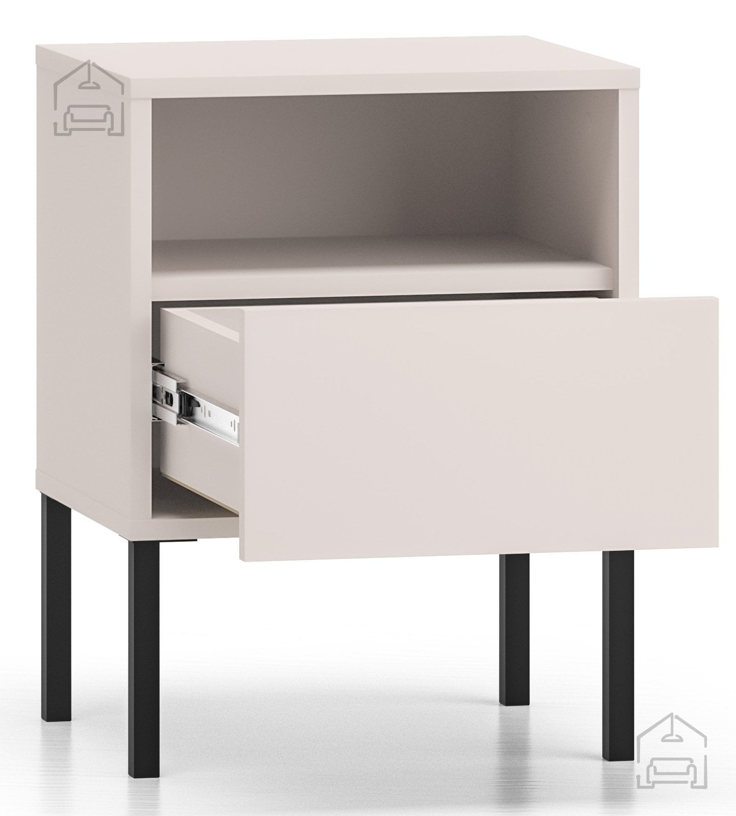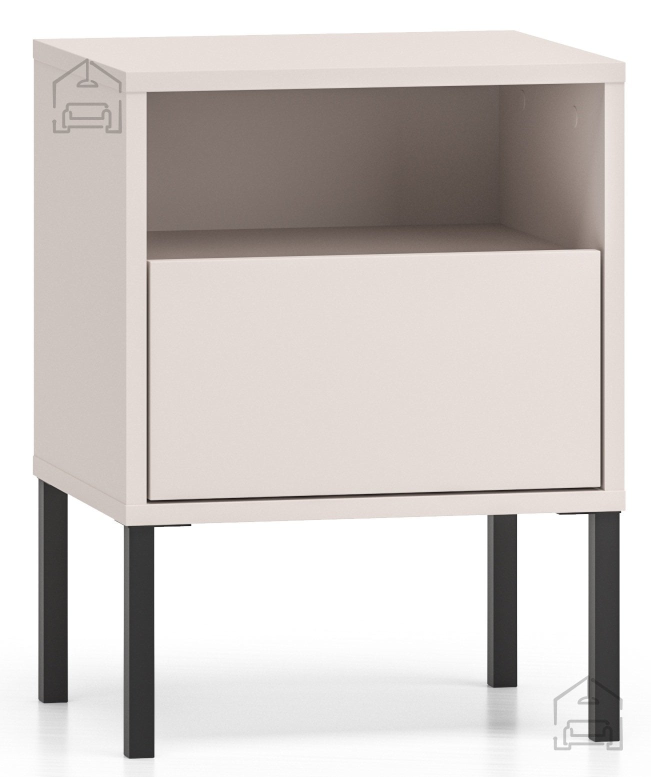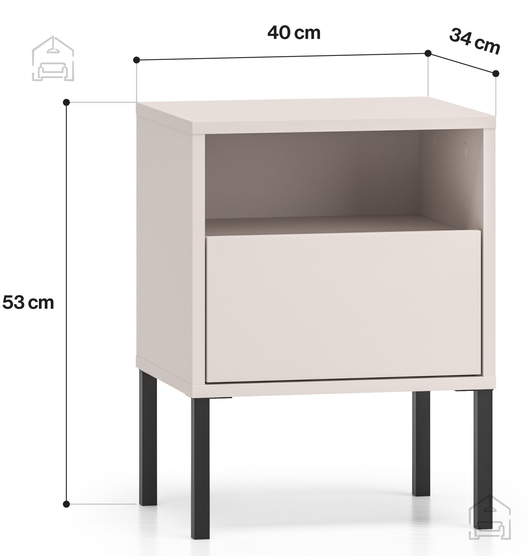 Nočna omarica Barnee 05 v barvi kašmir z značilnimi črnimi detajli je prefinjen kos pohištva, ki prinaša toplino in eleganco v vašo spalnico. S svojimi kompaktnimi dimenzijami 40x34x53 cm se popolno prilega ob posteljo, hkrati pa nudi praktičen prostor za odlaganje najnujnejših predmetov. Izdelana je iz kakovostnih materialov MDF in iverala, ki zagotavljata trdnost, odpornost in dolgo življenjsko dobo, medtem ko kovinski okvir in visoke noge poskrbijo za stabilnost ter vizualno lahkotnost.