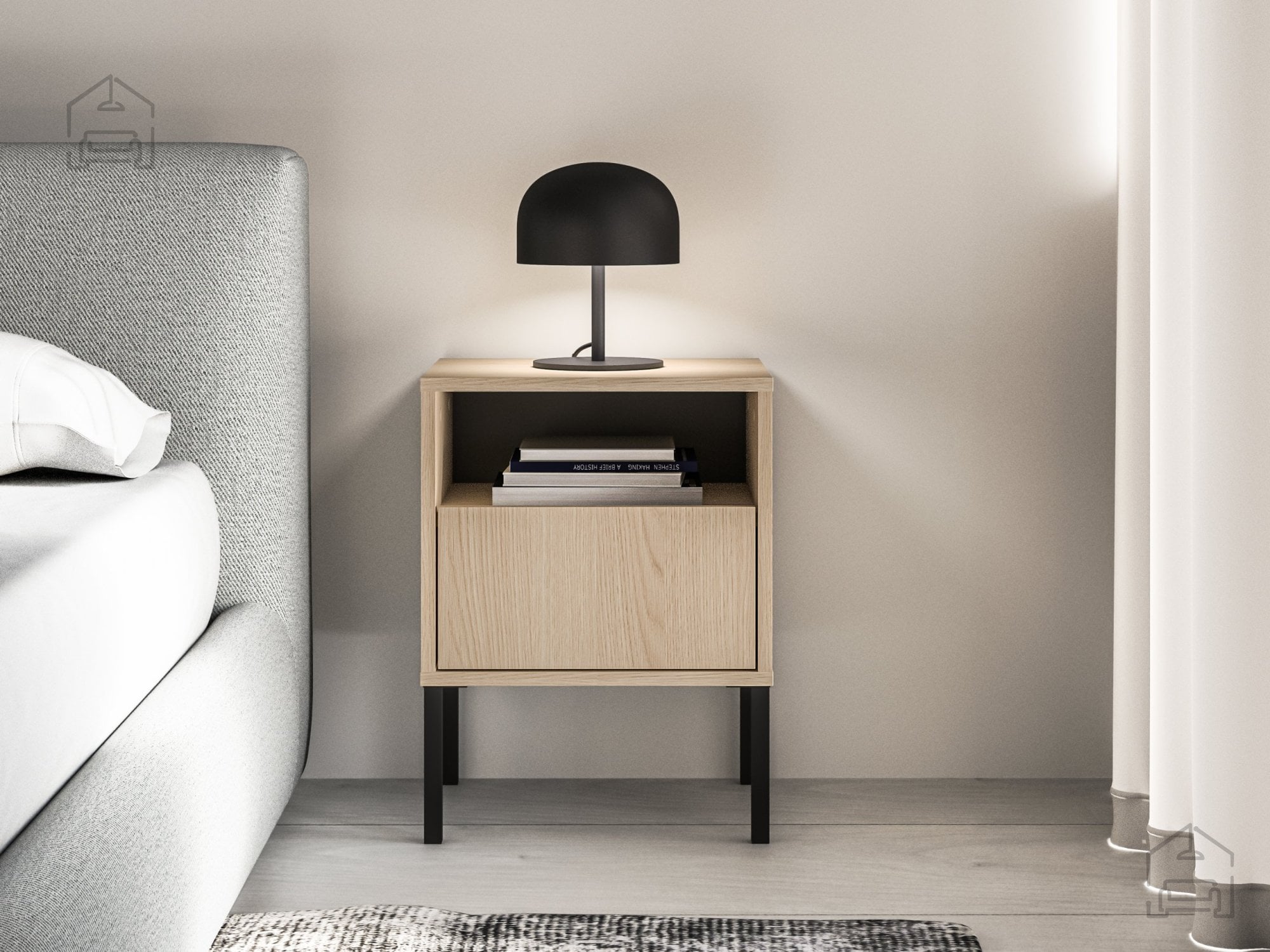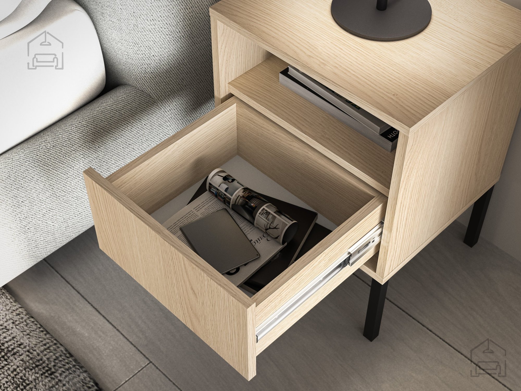Model Barnee 05 je zasnovan z mislijo na vsakodnevno udobje. Omarica ima prostoren predal, ki se odpira na krogličnih vodilih, kar omogoča gladko in tiho delovanje. Popoln izvlek predalov pomeni, da lahko celotno notranjost uporabite brez napora, saj se predal izvleče do konca. To je še posebej praktično, če želite imeti vse potrebne predmete pri roki – od knjig in očal do osebnih dodatkov.