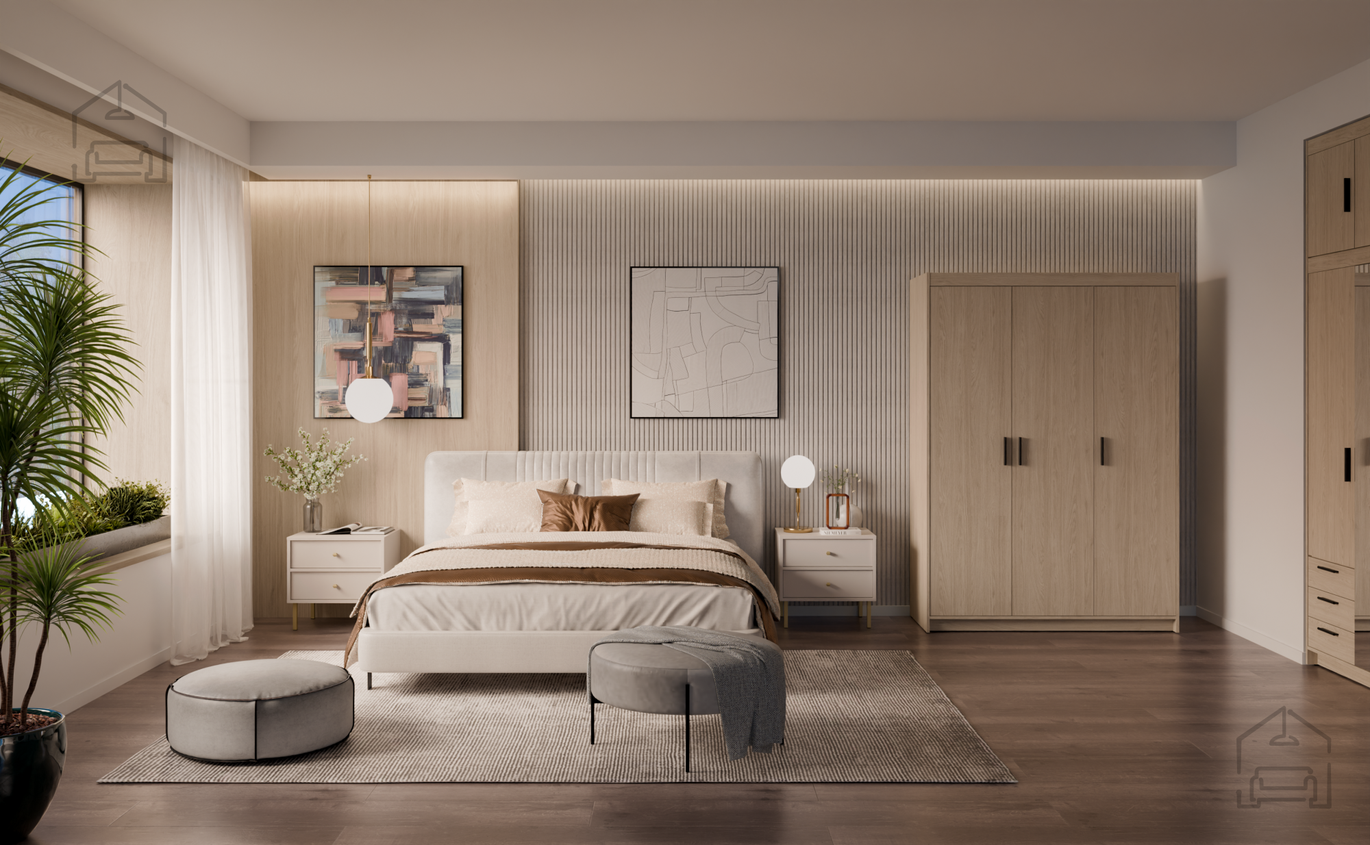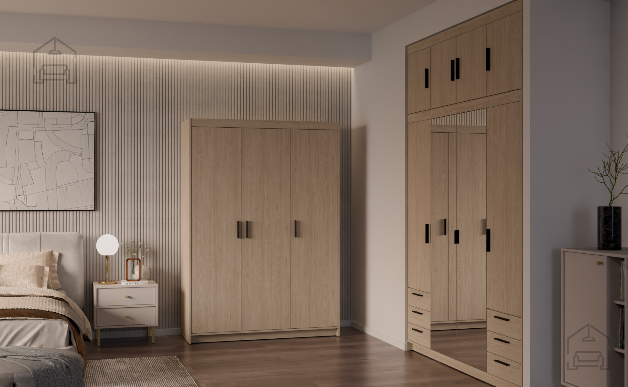 Garderobna omara je vsestransko uporabna – lahko stoji samostojno kot osrednji kos v spalnici ali predsobi, ali pa se kombinira z drugimi elementi iz iste linije. Zaradi nevtralne barve se lepo dopolnjuje z različnimi teksturami in materiali, kot so les, kovina ali tkanina. Njena preprosta oblika omogoča, da se osredotočite na funkcionalnost in estetiko prostora, ne da bi bila omara preveč dominantna.