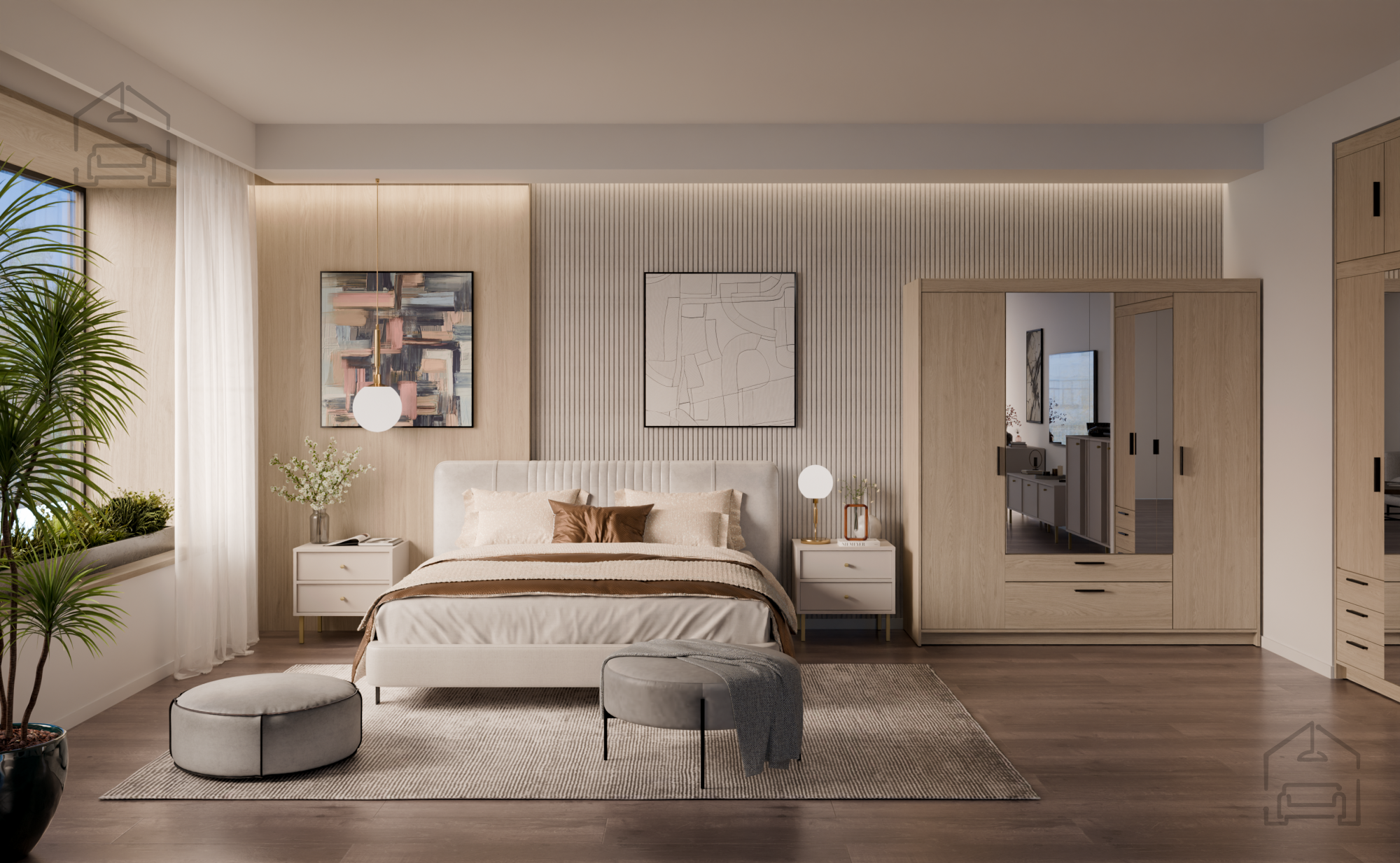 Na eni izmed vrat omare je nameščeno veliko ogledalo, ki poveča občutek prostornosti in hkrati omogoča priročno preverjanje videza pred odhodom od doma. Odsevna površina je elegantno integrirana v zasnovo vrat, kar prispeva k uravnoteženemu videzu in sodobni estetiki.