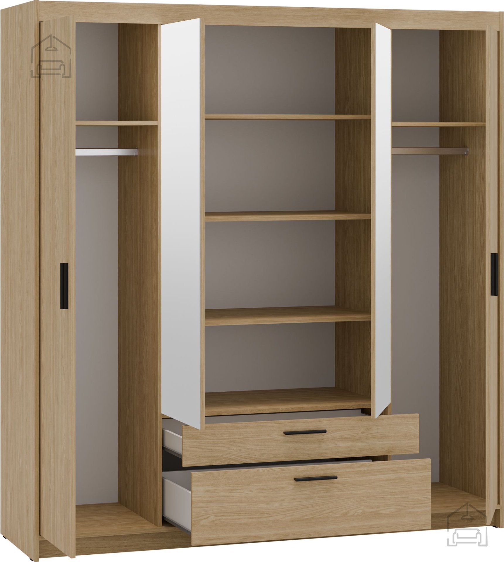 Notranjost garderobne omare Elena DO04 je zasnovana za pregledno shranjevanje. Prostori za obešanje in police omogočajo razporeditev oblačil po kategorijah, kar olajša vsakodnevno uporabo. Stabilna konstrukcija iz 15-milimetrskih plošč prispeva k dolgotrajni obstojnosti in zanesljivosti, medtem ko gladke površine omogočajo enostavno čiščenje s suho ali rahlo vlažno krpo.
