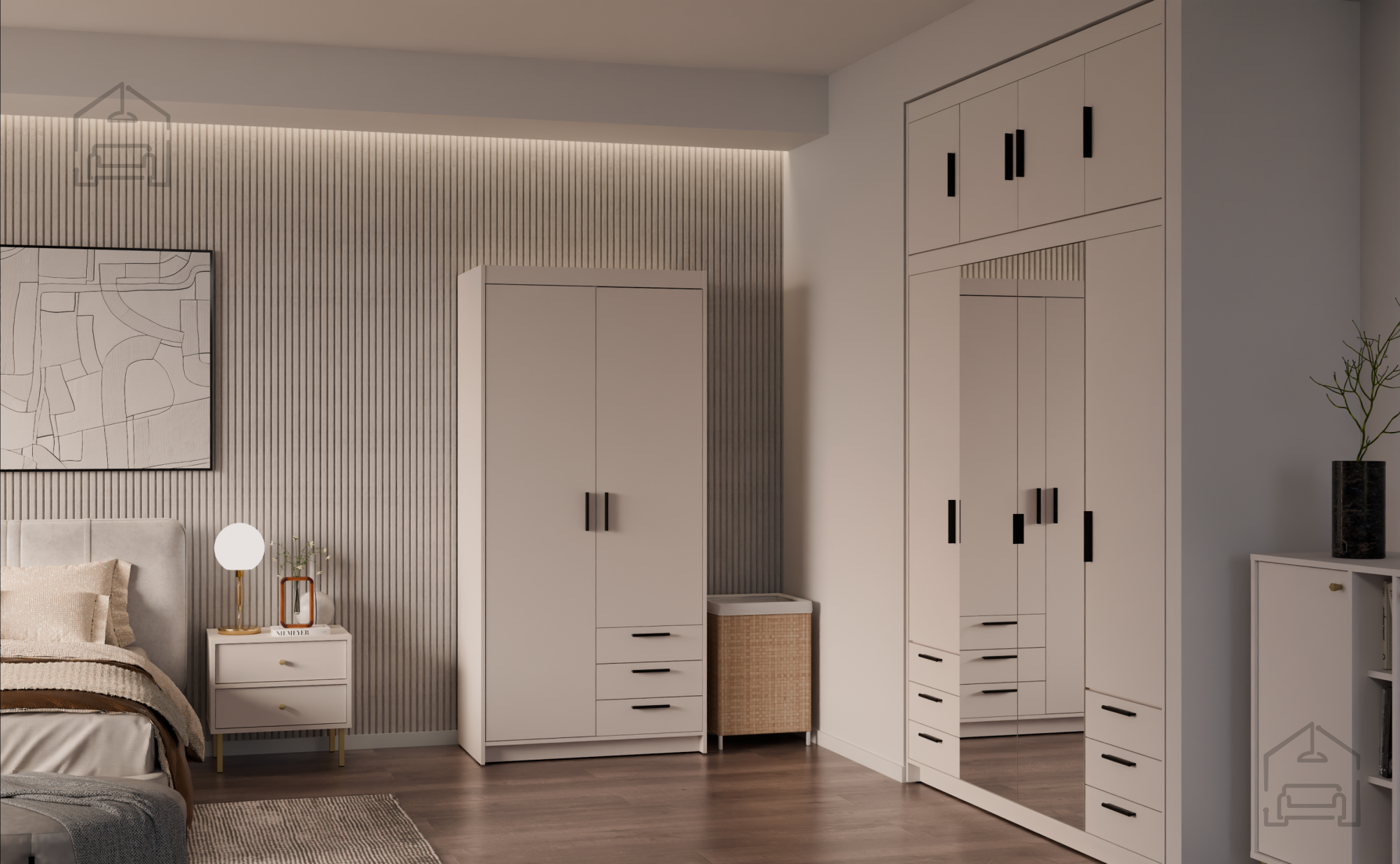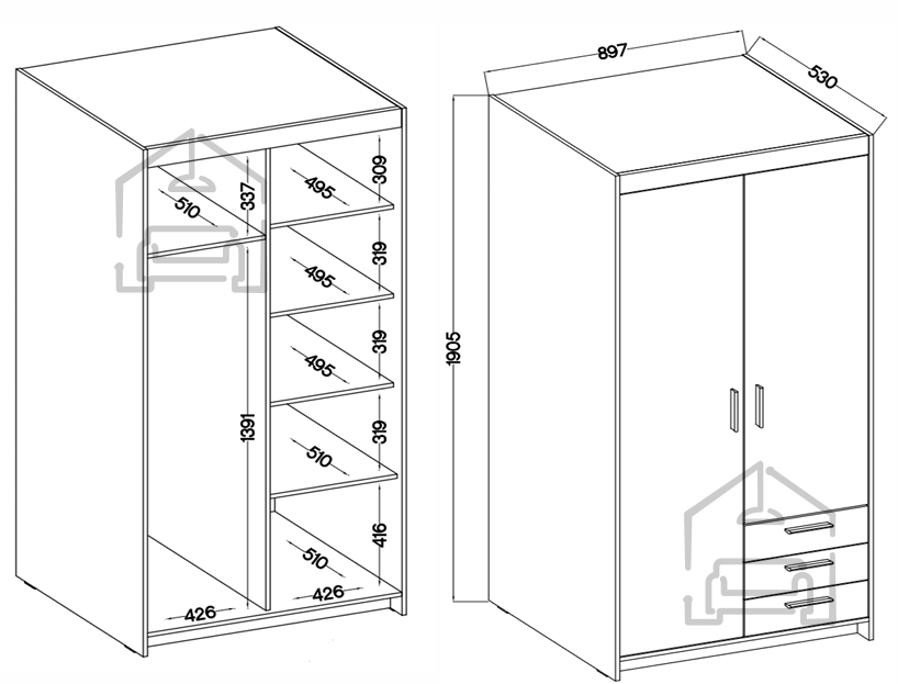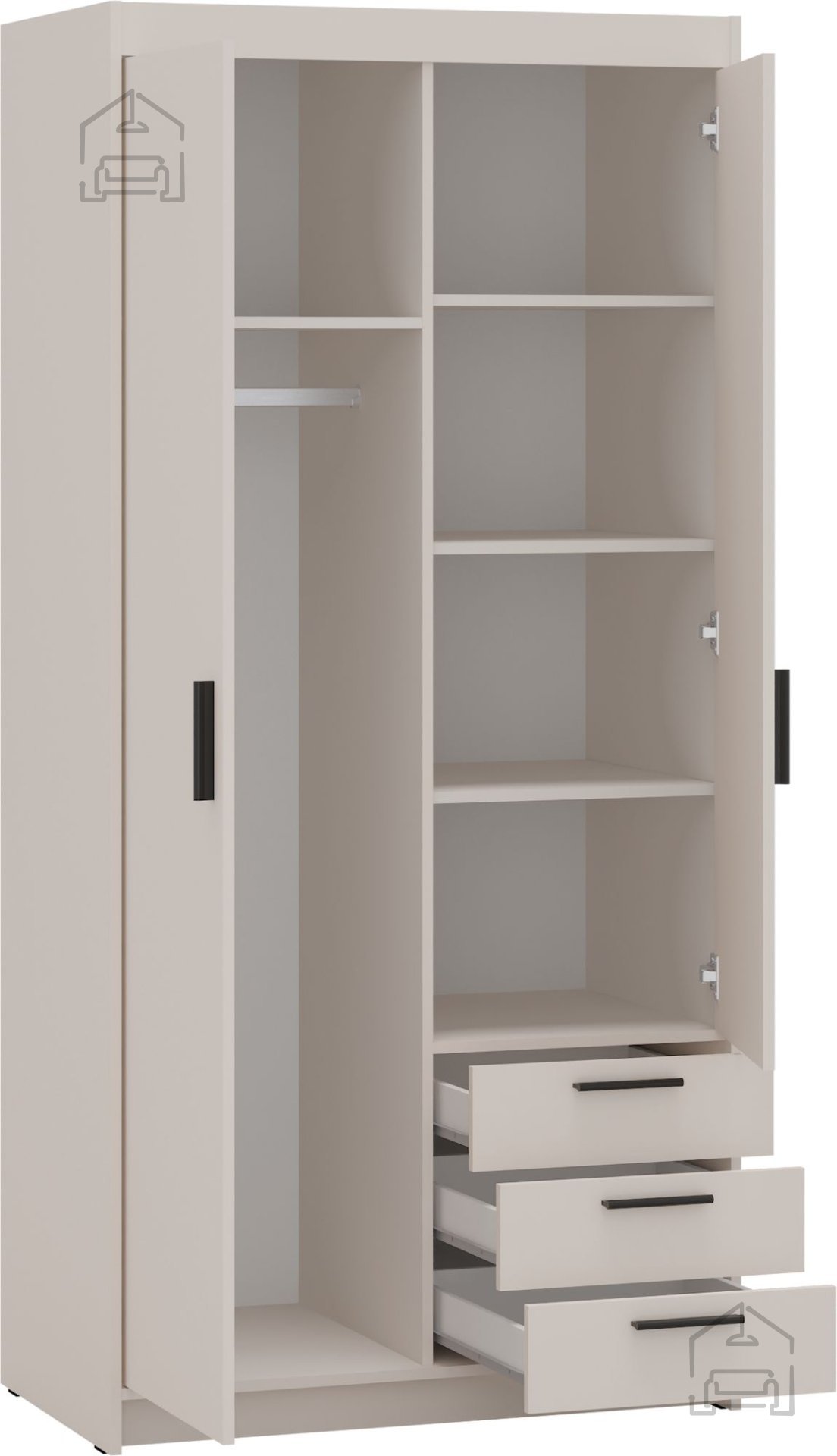 Notranjost omare je razdeljena tako, da omogoča kombinacijo obešanja in zlaganja. Ena stran je običajno namenjena obešalniku za daljša oblačila, druga pa policam, kjer je mogoče pregledno zložiti majice, puloverje ali posteljnino. Tako ostane garderoba urejena, vsebina pa vedno dostopna.