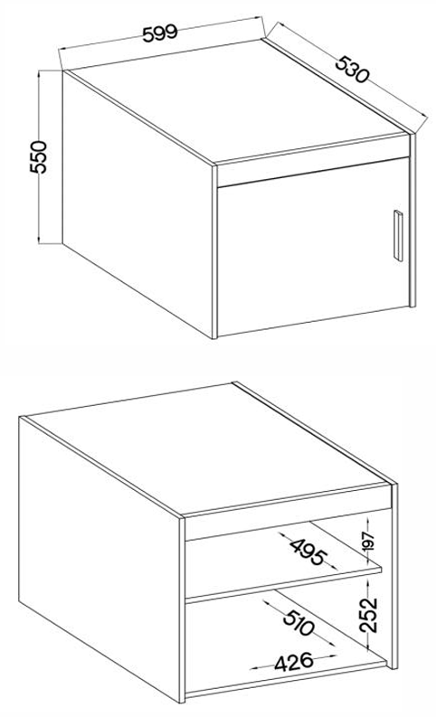 Omara meri 59,9×53×55 cm, kar jo uvršča med kompaktne, a prostorne elemente kuhinjskega ali dnevnega sestava. Zaradi uravnoteženih dimenzij omogoča optimalen izkoristek prostora nad delovno površino ali v višjih delih pohištvene kompozicije. Njen notranji volumen je dovolj velik za shranjevanje posode, kozarcev, začimb ali drugih kuhinjskih pripomočkov, hkrati pa ohranja zunanji videz urejen in minimalističen.