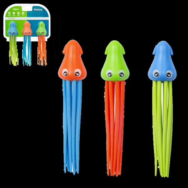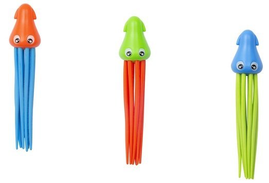 Komplet vključuje tri potapljaške hobotnice, ki so namenjene uporabi v bazenu ali plitvem morju. Vsaka hobotnica ima vgrajeno utež, ki poskrbi, da se hitro potopi in ostane stabilna na dnu. Zaradi svoje mehke, a trpežne izdelave so igrače varne za uporabo in primerne za otroke, stare od 3 let dalje. Materiali, uporabljeni pri izdelavi, so preverjeni in ne vsebujejo lateksa, zato so prijazni do kože in ne povzročajo alergijskih reakcij.