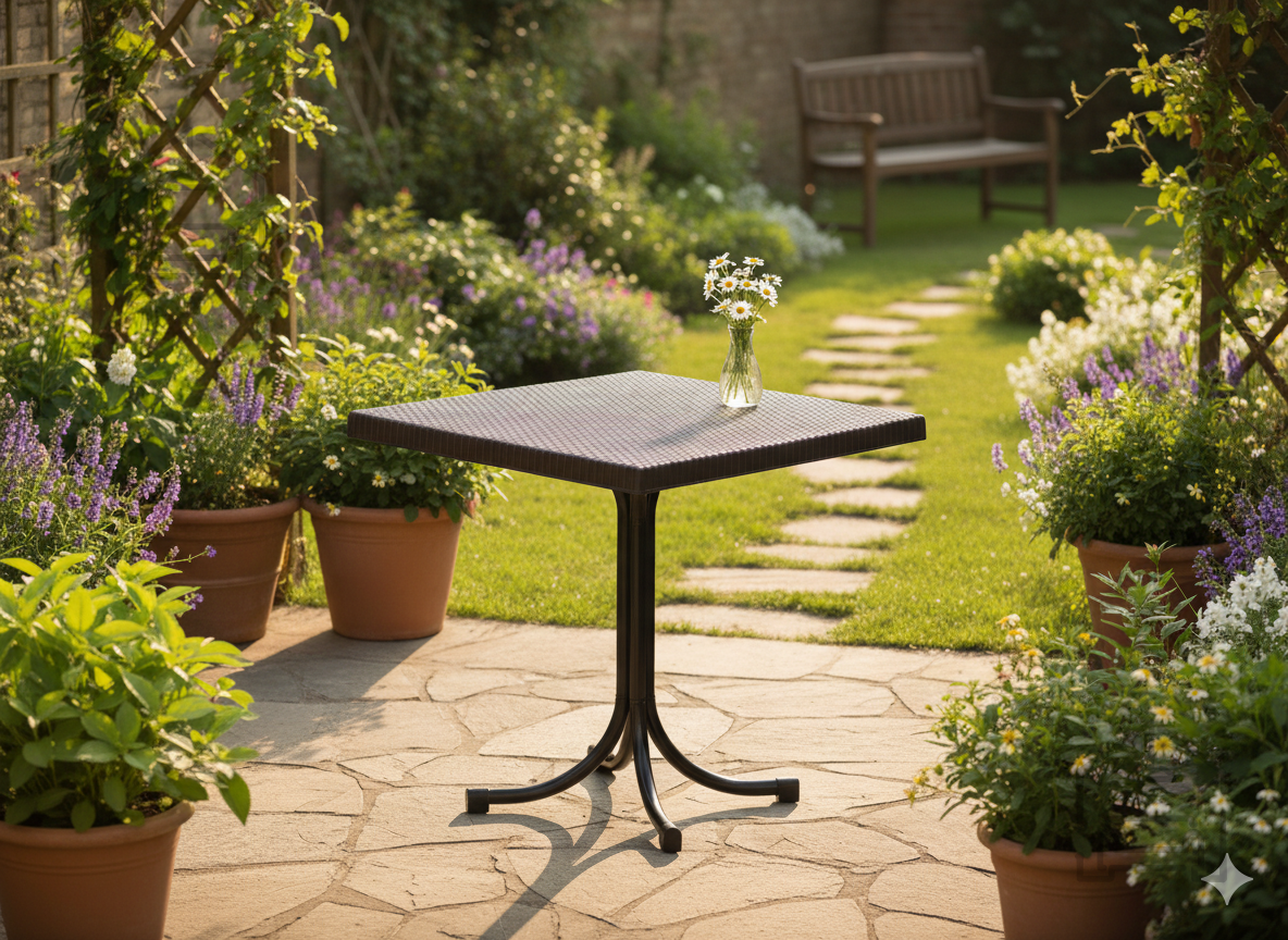 Dimenzije 80x80x73 cm pomenijo, da miza ponuja dovolj prostora za štiri osebe, hkrati pa ne zavzame preveč prostora. Njene kompaktne mere omogočajo uporabo tudi na manjših površinah, kot so balkoni ali manjše terase. Višina 73 cm zagotavlja udobno sedenje ob standardnih vrtnih stolih, kvadratna oblika pa omogoča preprosto postavitev in enakomerno porazdelitev prostora za vse uporabnike.
