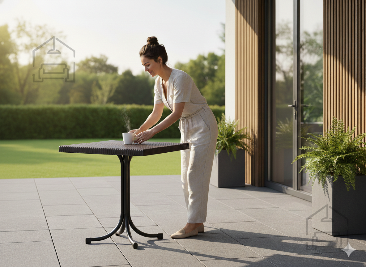 Ena izmed ključnih prednosti vrtne mize CT063/BR je njena odpornost na različne vremenske razmere. Uporabljeni materiali ne vpijajo vode, zato miza ne nabrekne in ne spremeni oblike ob izpostavljenosti dežju ali vlagi. Prav tako je odporna na UV-žarke, kar preprečuje bledenje barve ob dolgotrajni izpostavljenosti soncu. Površina se enostavno čisti – dovolj je vlažna krpa in blag detergent, brez potrebe po posebnih čistilih ali zaščitnih premazih.