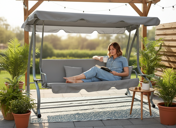 Elegantna siva barva in sodoben dizajn omogočata, da se gugalnica lepo ujema z različnimi vrstami vrtnega pohištva in zunanjimi ureditvami. Lahko jo postavite na travo, teraso ali ob bazen – povsod bo dodala pridih udobja in stila. Zaključna zavesa ob robu konstrukcije ustvari občutek zasebnosti ter zaščiti pred rahlim vetrom ali soncem.