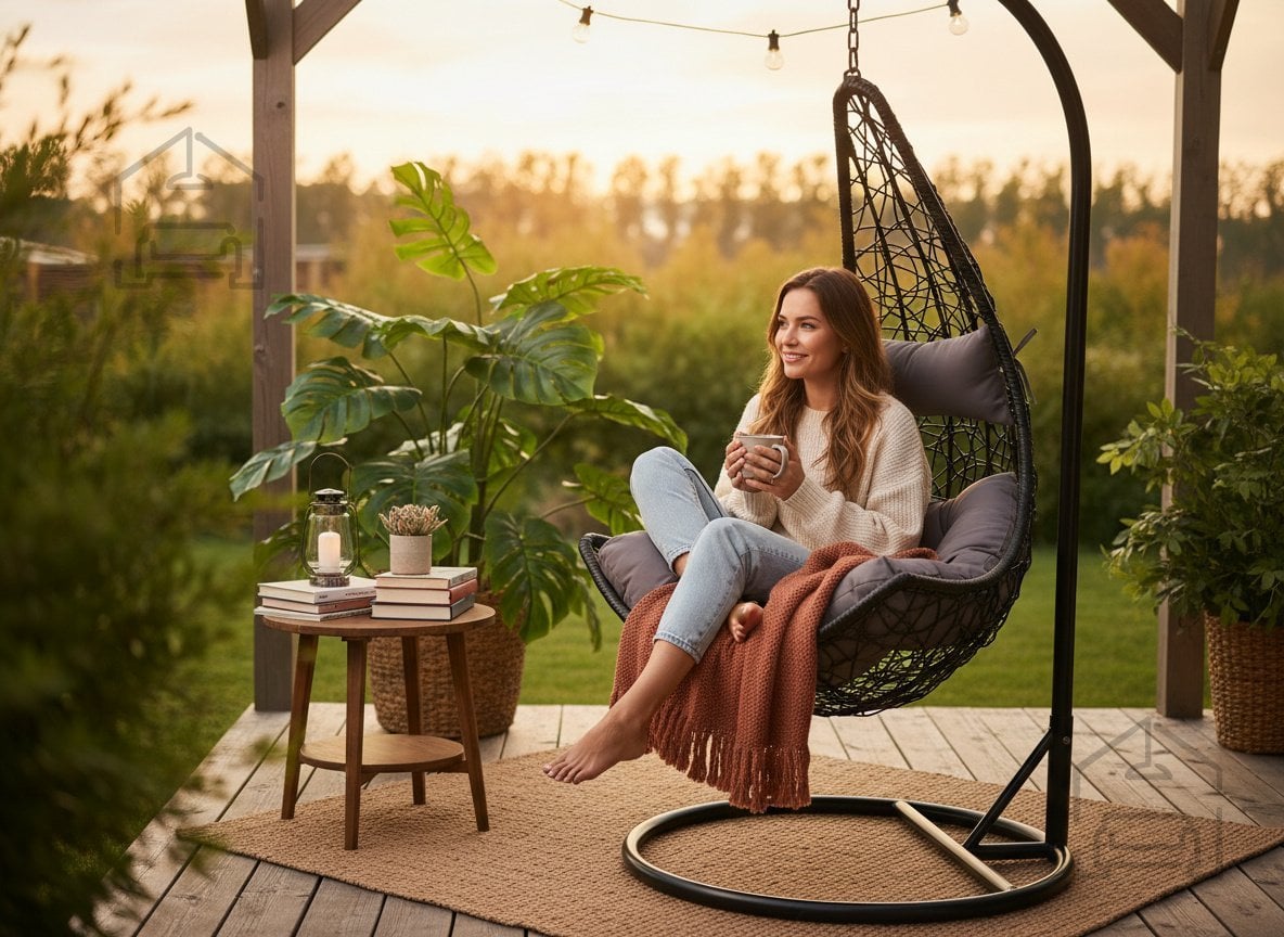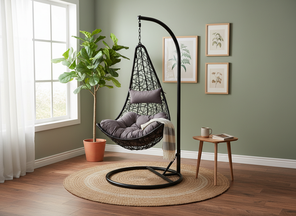 Viseči vrtni fotelj Chomik FAT2623 je popolna izbira za vse, ki si želijo udobja, estetike in trajnosti v enem izdelku. Njegova elegantna črna barva, trdna jeklena konstrukcija in prijeten občutek ratana ustvarjajo idealno mesto za sprostitev – doma, na vikendu ali kjerkoli v naravi.