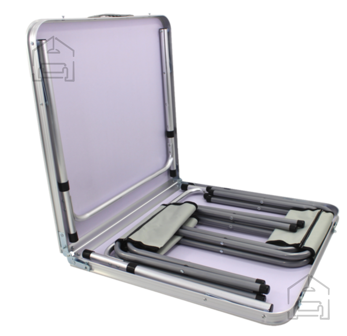 Postavitev mize je hitra in intuitivna: preprosto odklenite zapah, razprite obe polovici, razširite noge na želeno višino in jo zavarujte. Ko je miza pravilno razprta in zaklenjena, stoji stabilno in varno. Zložljiv mehanizem omogoča, da jo pospravite v nekaj trenutkih, kar je izredno priročno po uporabi. Zaradi aluminijaste konstrukcije in lahkega PVC vrha je miza enostavna za čiščenje – dovolj je vlažna krpa in blago čistilo.