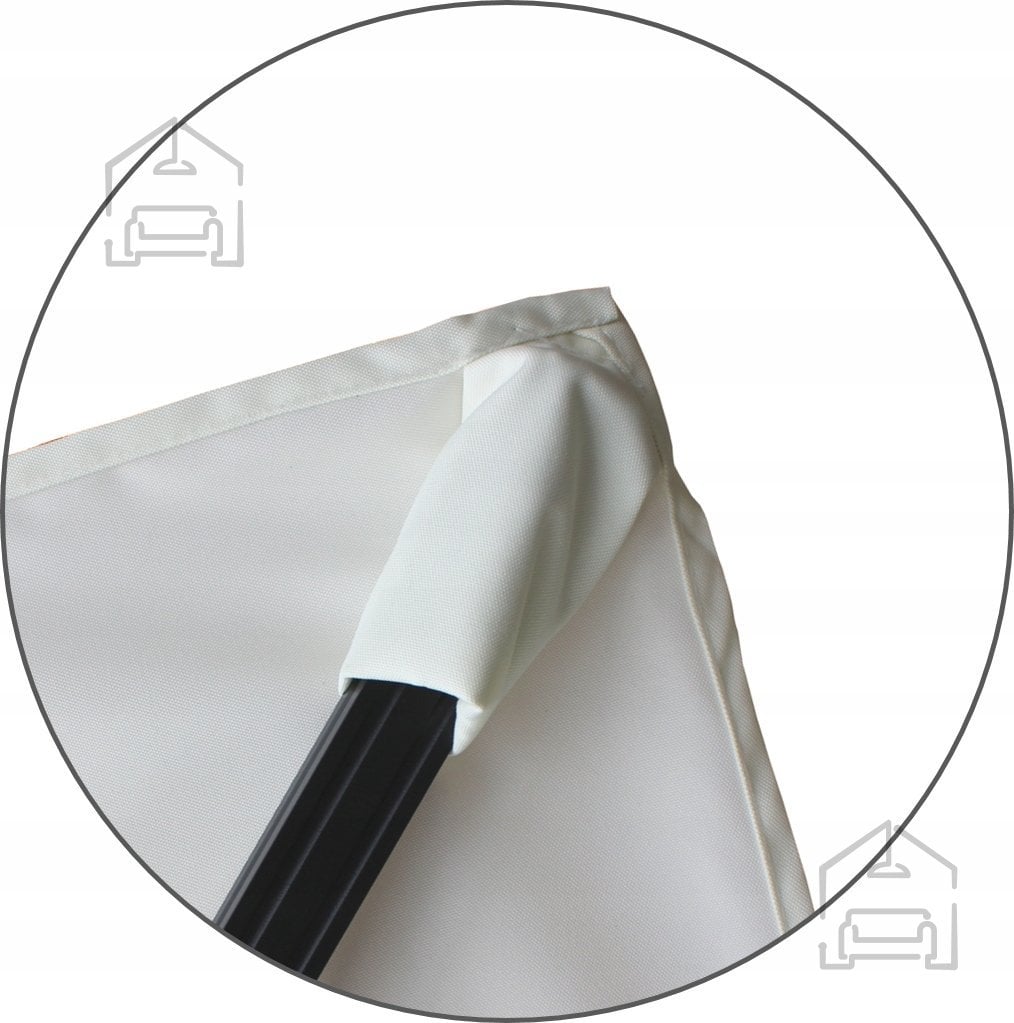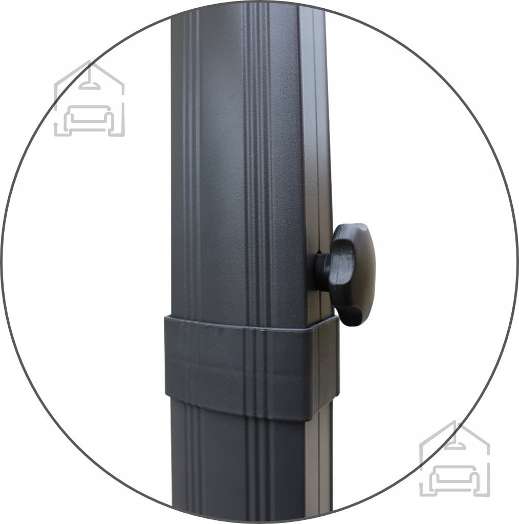 Senčnik meri 300 x 400 x 250 cm, zato nudi obsežno zasenčeno površino, primerno za uporabo na terasah, balkonih ali v vrtnih kotičkih. Glavni stojni profil je izdelan iz aluminija, prašno lakiranega v sivo barvo, z merami 53 x 77 x 2 mm. Ta dimenzija zagotavlja visoko stabilnost in odpornost proti deformacijam. Viseči profil iz prašno barvanega aluminija (25 x 40 x 3 mm) povezuje ogrodje z baldahinom in omogoča gladko gibanje pri odpiranju in zapiranju.