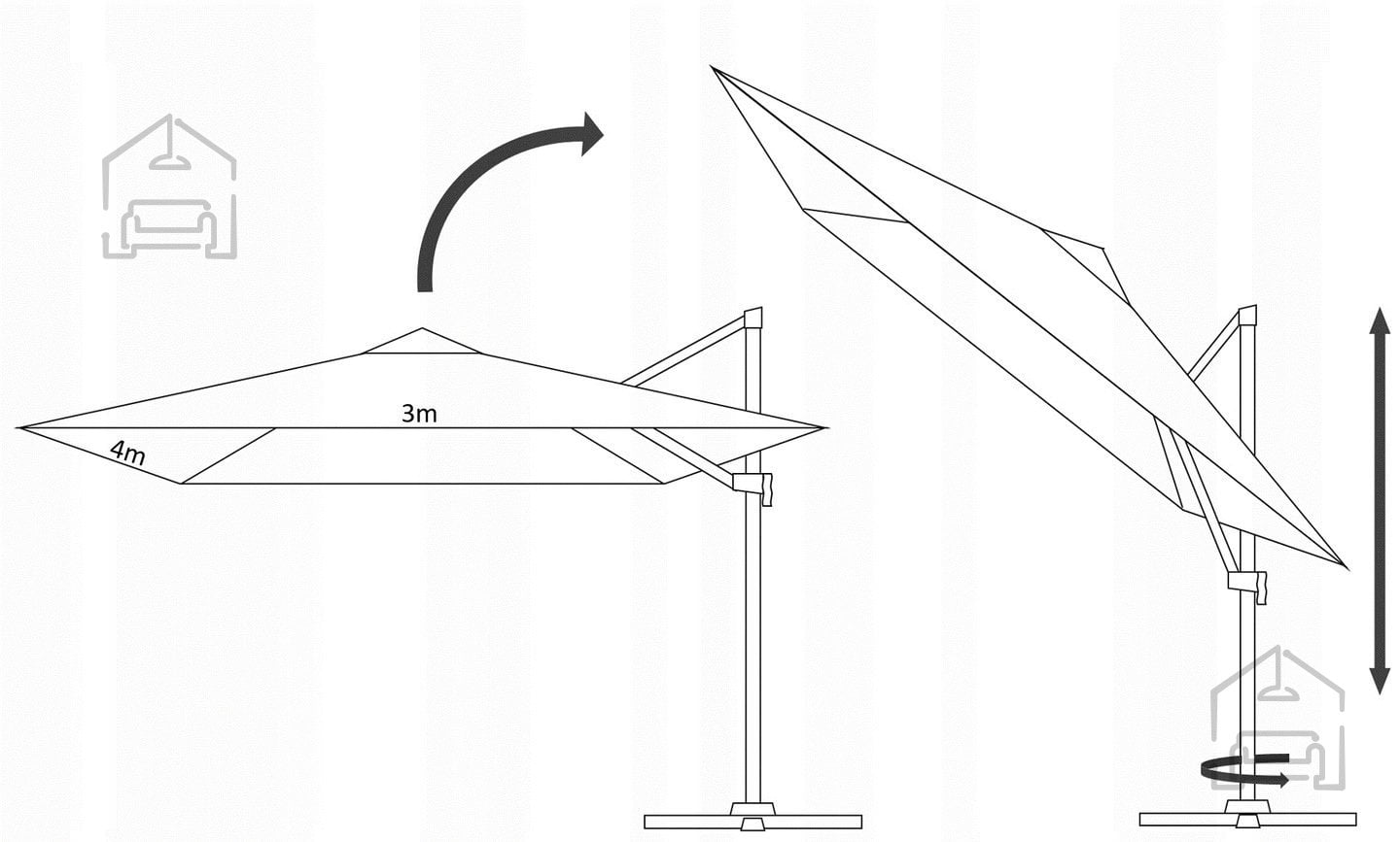 Senčnik GAO5415 omogoča 360-stopinjsko vrtenje in nastavitev naklona baldahina, zato se enostavno prilagodi položaju sonca skozi ves dan. S pomočjo integriranega ročaja s ključavnico se senčnik odpira in zapira hitro ter brez napora. Zaradi te funkcionalnosti je idealen za vsakodnevno uporabo v zasebnih vrtovih, na terasah restavracij ali v hotelskih zunanjih prostorih.
