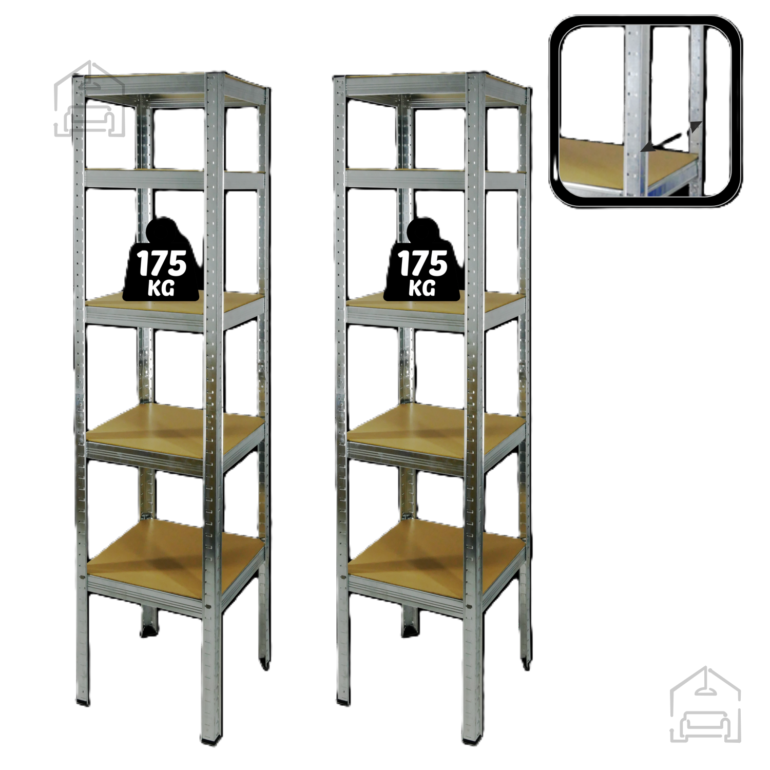 Regala sta izdelana iz kakovostnih materialov – kombinacija kovinskega okvirja in MDF polic zagotavlja visoko stabilnost. Kovinski profili so pocinkani, kar pomeni, da so odporni proti koroziji in mehanskim poškodbam. Takšna konstrukcija omogoča dolgo življenjsko dobo tudi pri intenzivni uporabi. MDF plošče so gladke in enostavne za čiščenje, obenem pa dovolj trdne za shranjevanje težjih predmetov. Vsaka polica prenese do 175 kg nosilnosti, zato je komplet primeren tudi za zahtevnejša okolja.