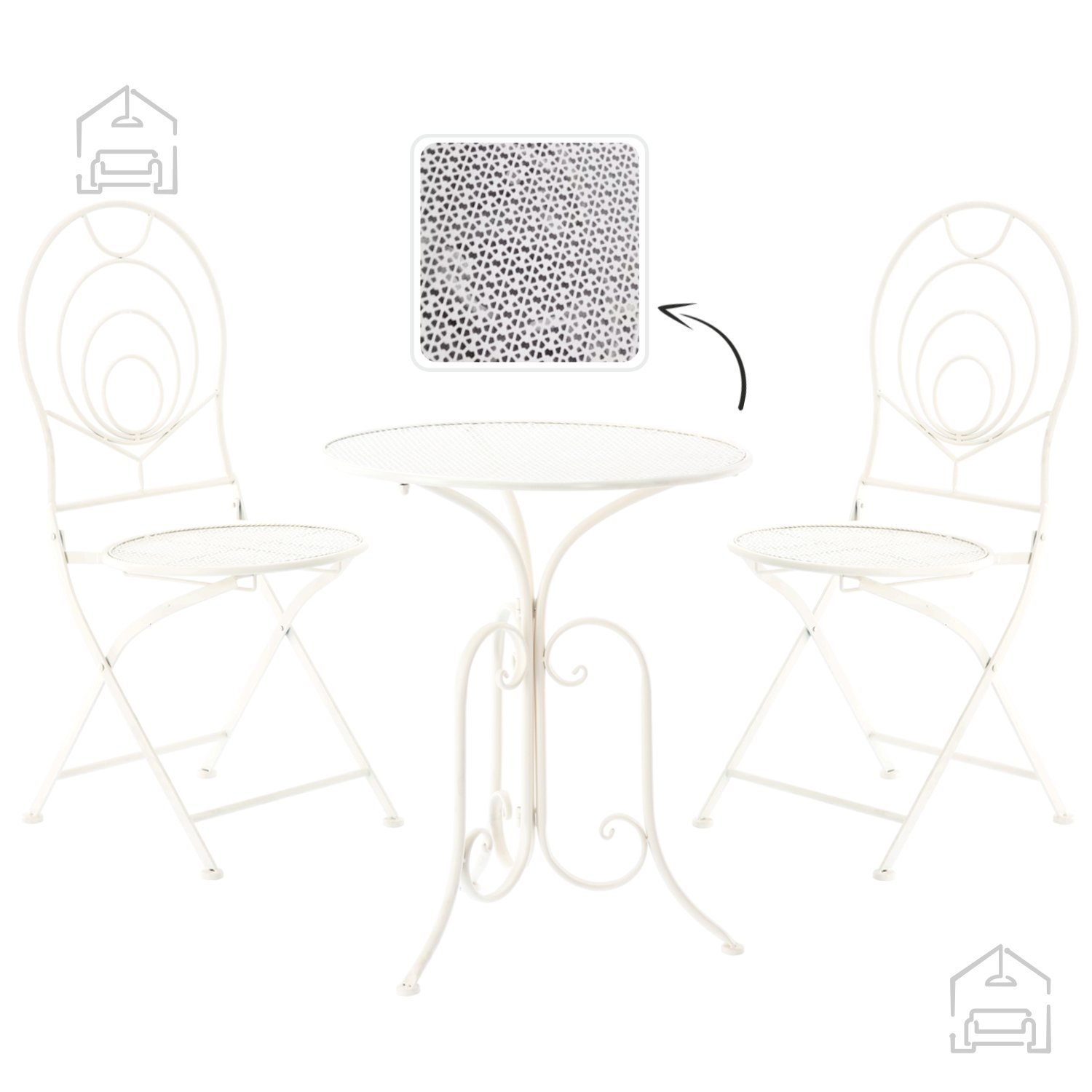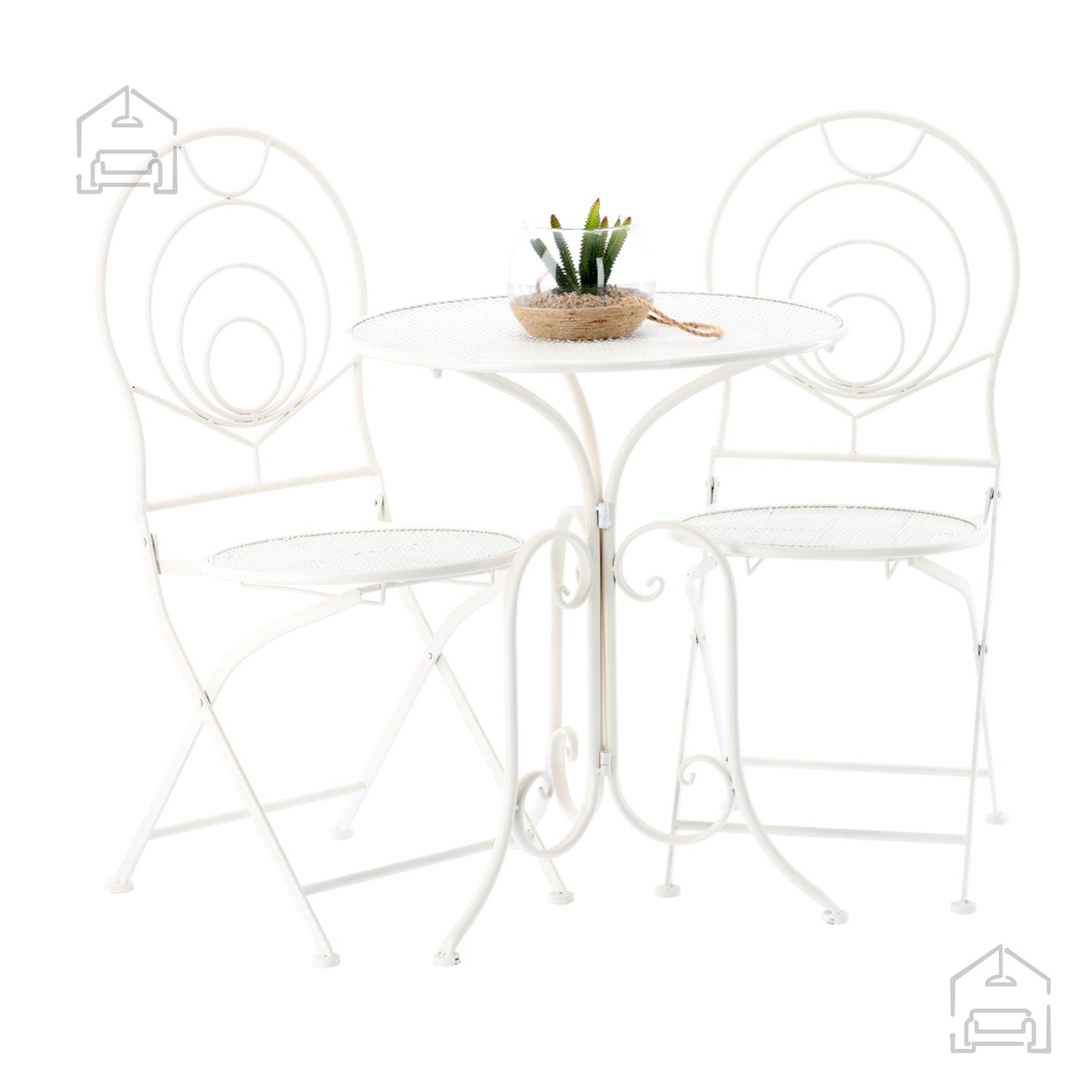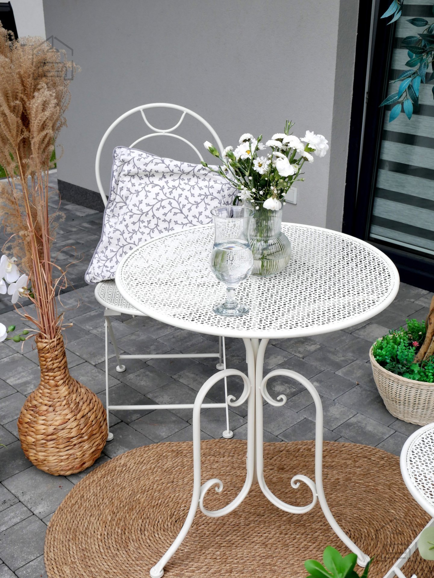 Uživajte v popolni kombinaciji elegance, udobja in funkcionalnosti z edinstvenim kompletom vrtnega pohištva, ki prinaša pridih romantičnega vintage sloga v vsak zunanji prostor. S svojo brezčasno belo barvo in kovinsko konstrukcijo, ki združuje vzdržljivost s prefinjenostjo, bo ta komplet postal osrednji element vašega vrta, terase ali balkona. Združuje estetiko klasičnega dizajna z modernimi materiali, kar pomeni, da ne ponuja le lepote, temveč tudi dolgo življenjsko dobo in odpornost na vremenske vplive.