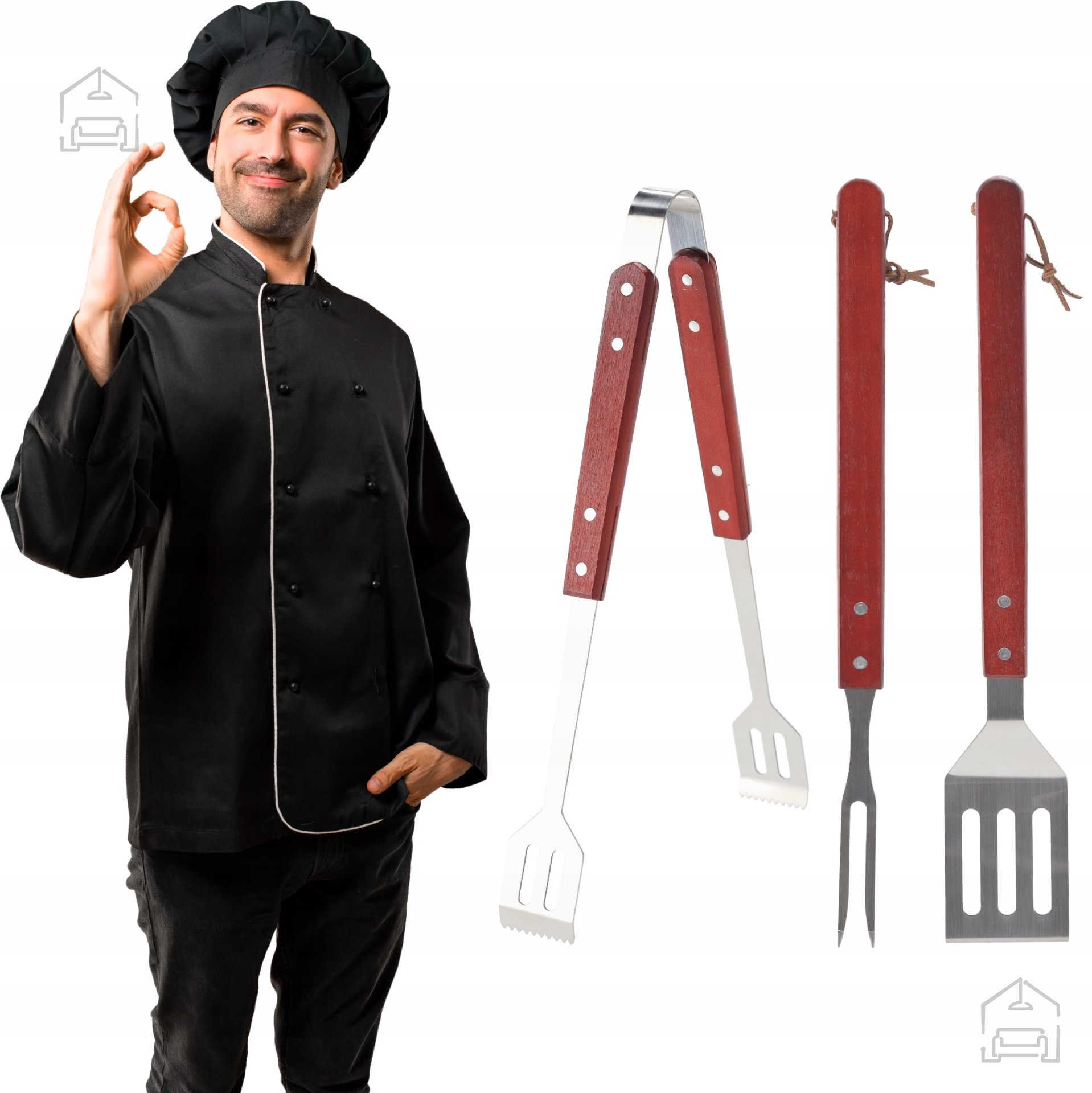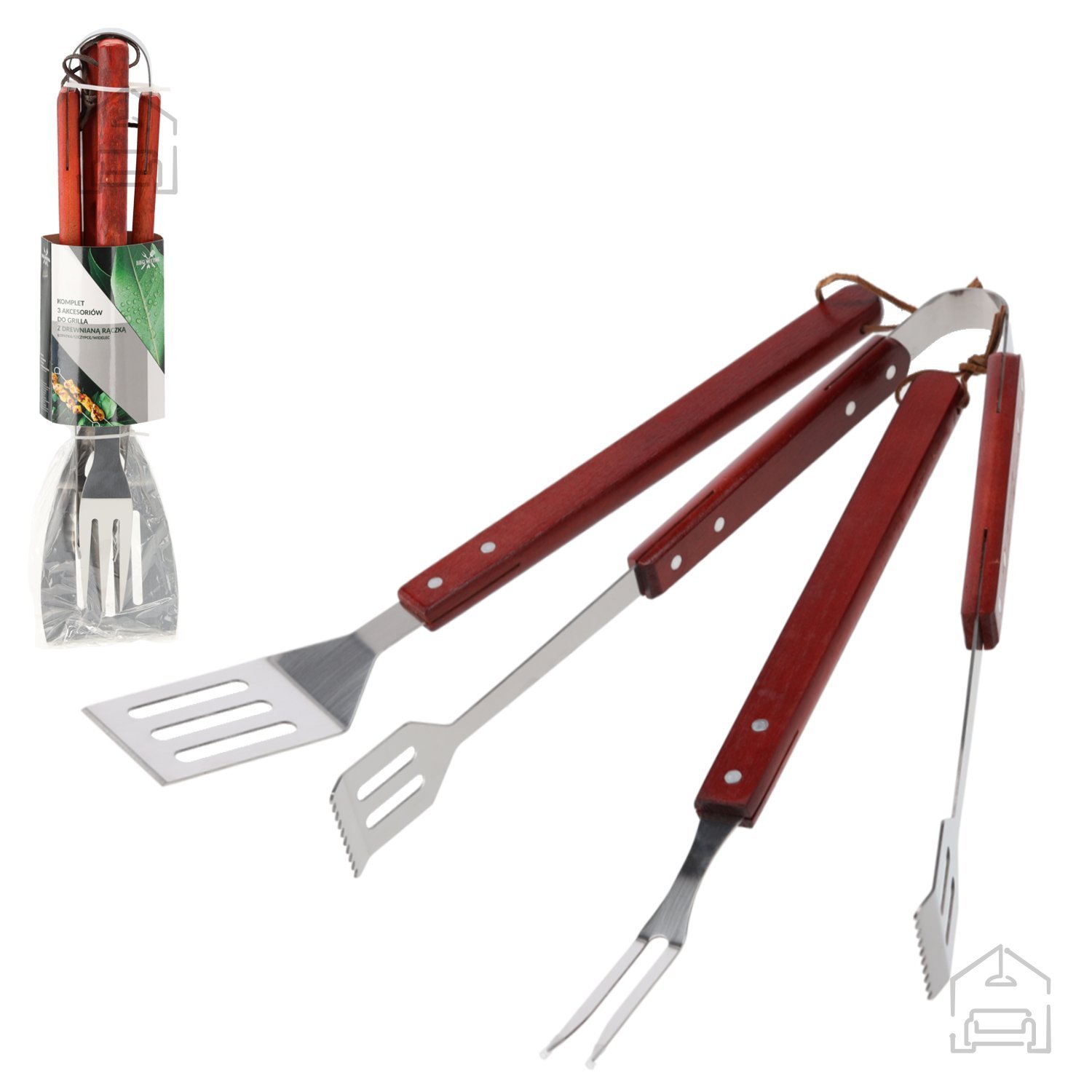 Komplet uporabnih in profesionalnih orodij ter pripomočkov za peko na žaru in piknike vsebuje potrebne jedilne pripomočke za varno in udobno pečenje ter pripravo na žaru. Ta nepogrešljiv set vsakega ljubitelja žara bo odlično opravil svojo nalogo! Kovinske klešče, velika vilica in lopatica za obračanje so izdelane iz visokokakovostnega nerjavečega jekla in lesa. Pripomočki imajo lesene ročaje, kar preprečuje opekline v primeru segrevanja jedilnih pripomočkov.