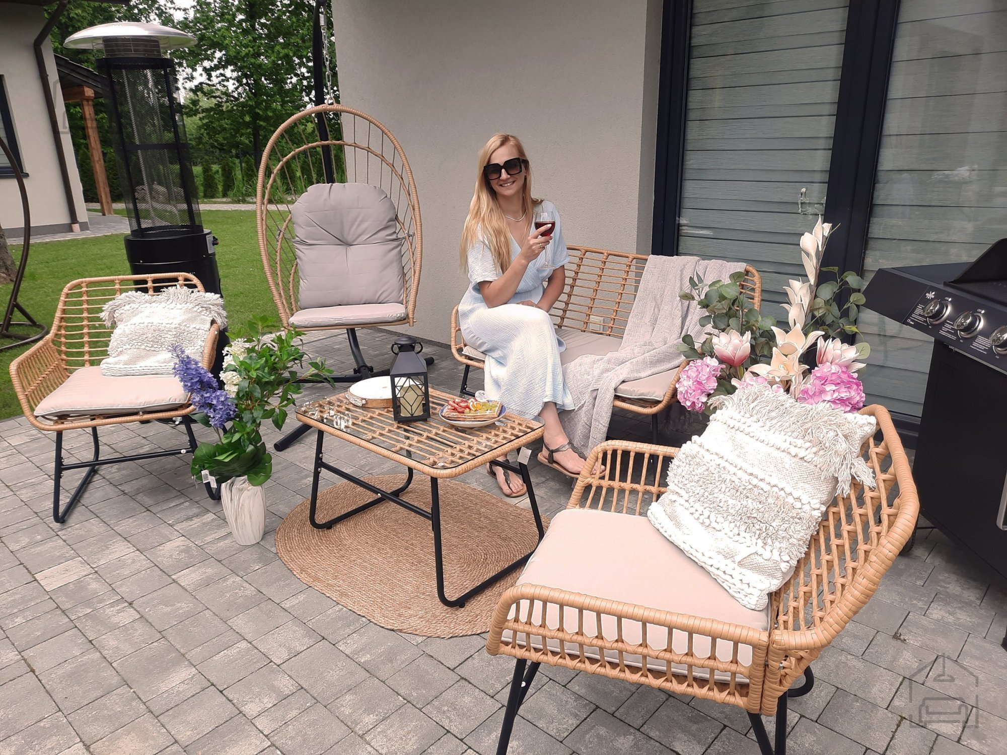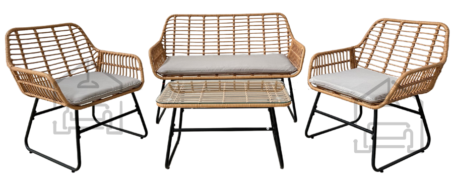 Stilski in funkcionalni komplet vrtnega pohištva, ki se odlično obnese na terasi, v vrtu ali na balkonu. Trdna jeklena konstrukcija, eleganten ratan ter udobne blazine zagotavljajo trajnost in udobje pri uporabi. Steklena plošča mizice doda eleganco in olajša vzdrževanje čistoče.
