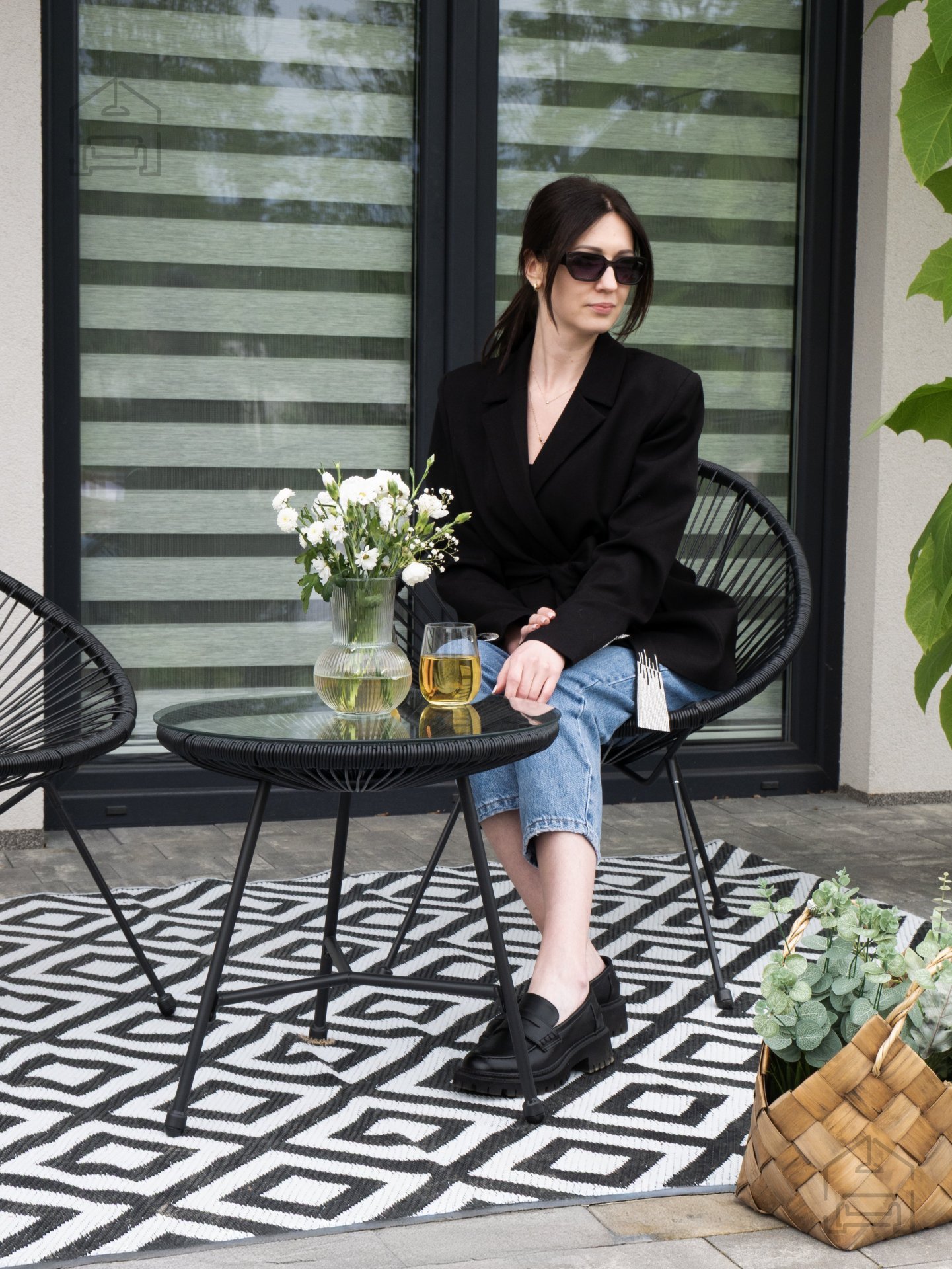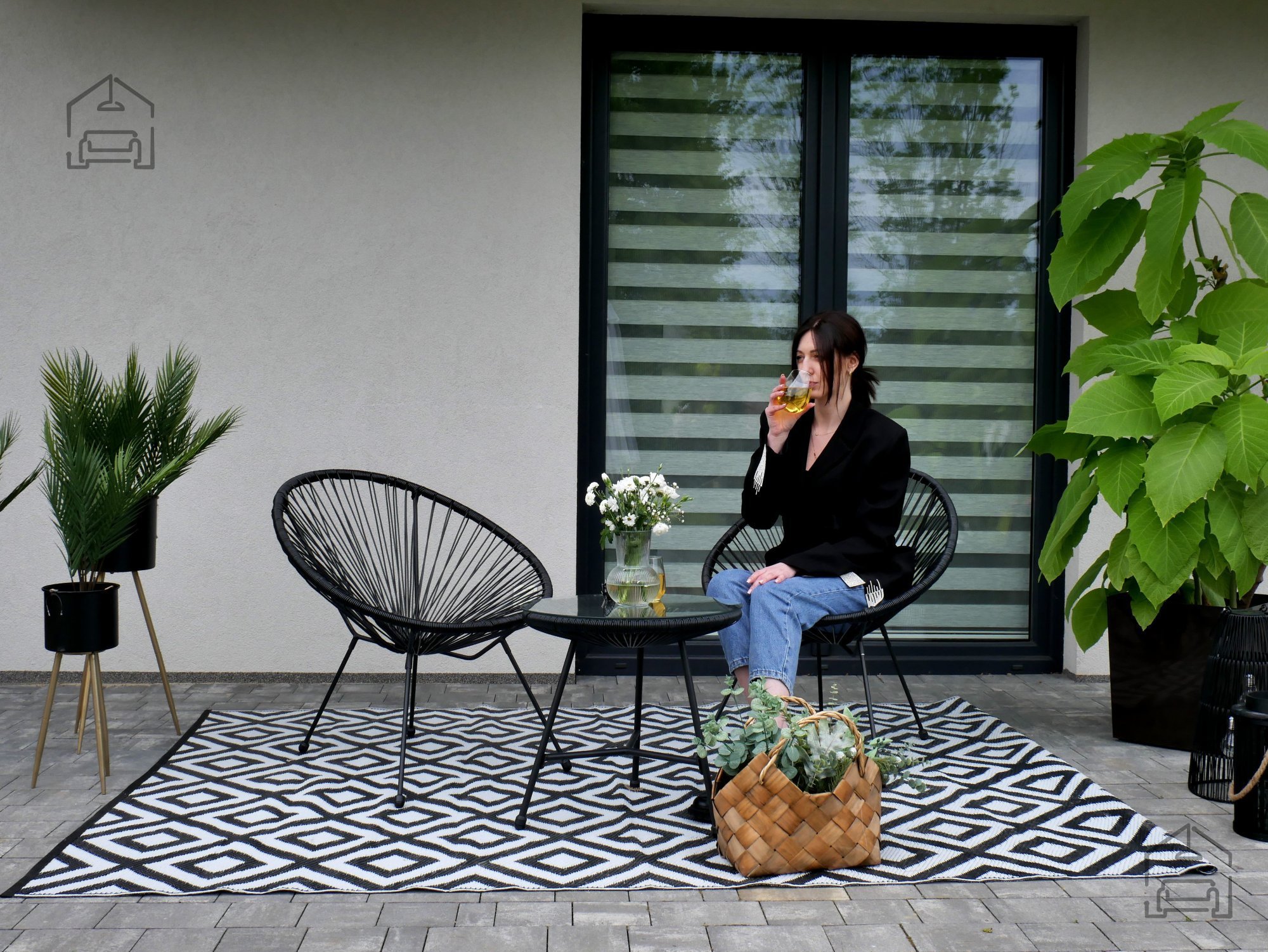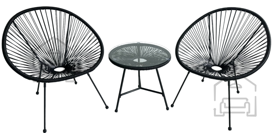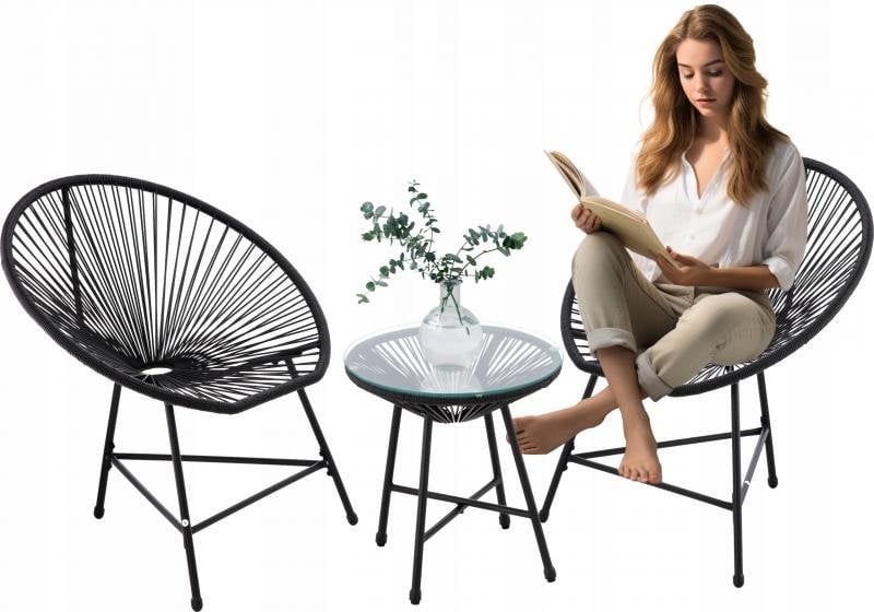Stilski in funkcionalni komplet vrtnega pohištva v črni barvi. Sestavljen je iz dveh udobnih stolov ter elegantne okrogle mizice s stekleno ploščo. Izdelan iz visokokakovostnih materialov zagotavlja trpežnost in odpornost na vremenske razmere. Odlična izbira za vrt, balkon ali teraso.