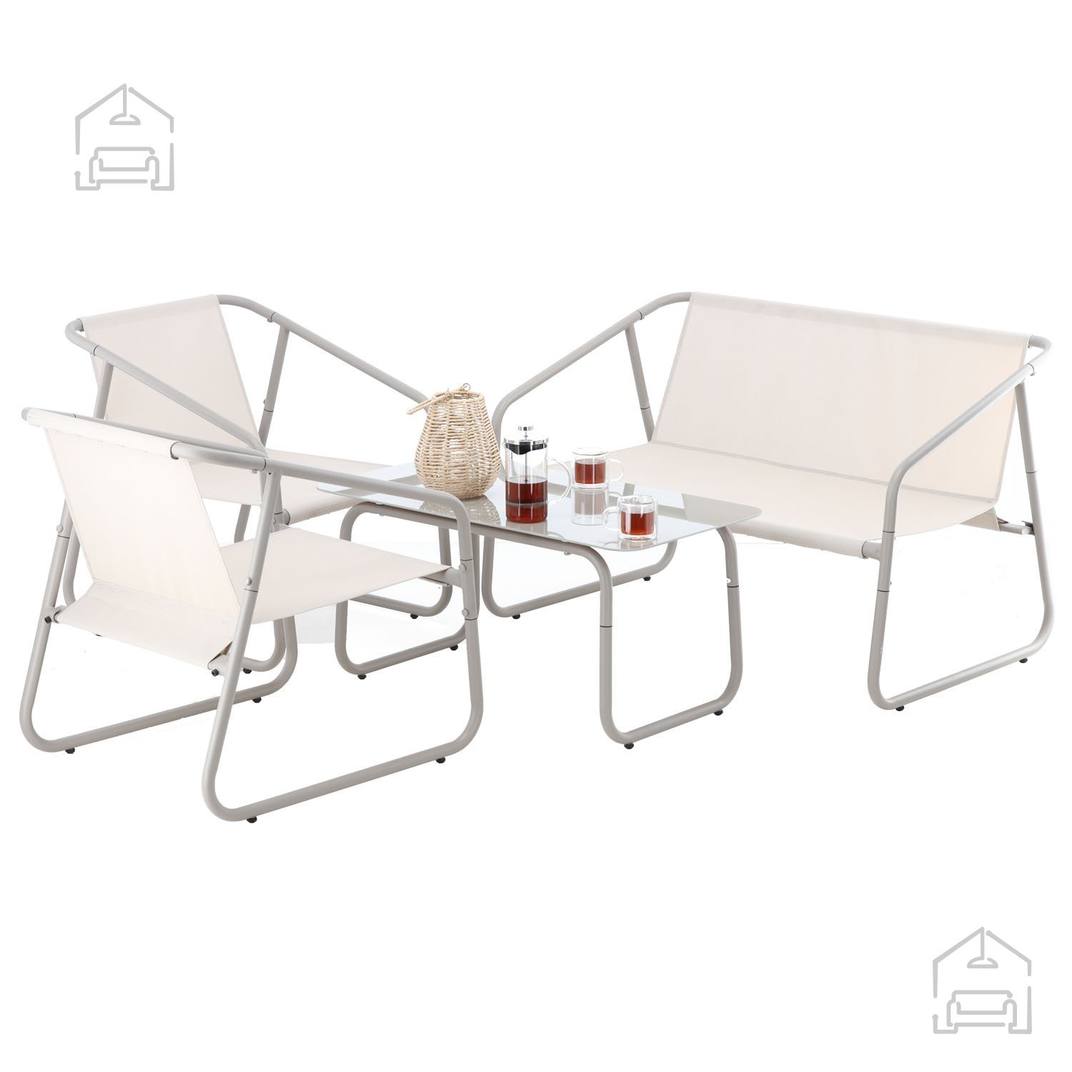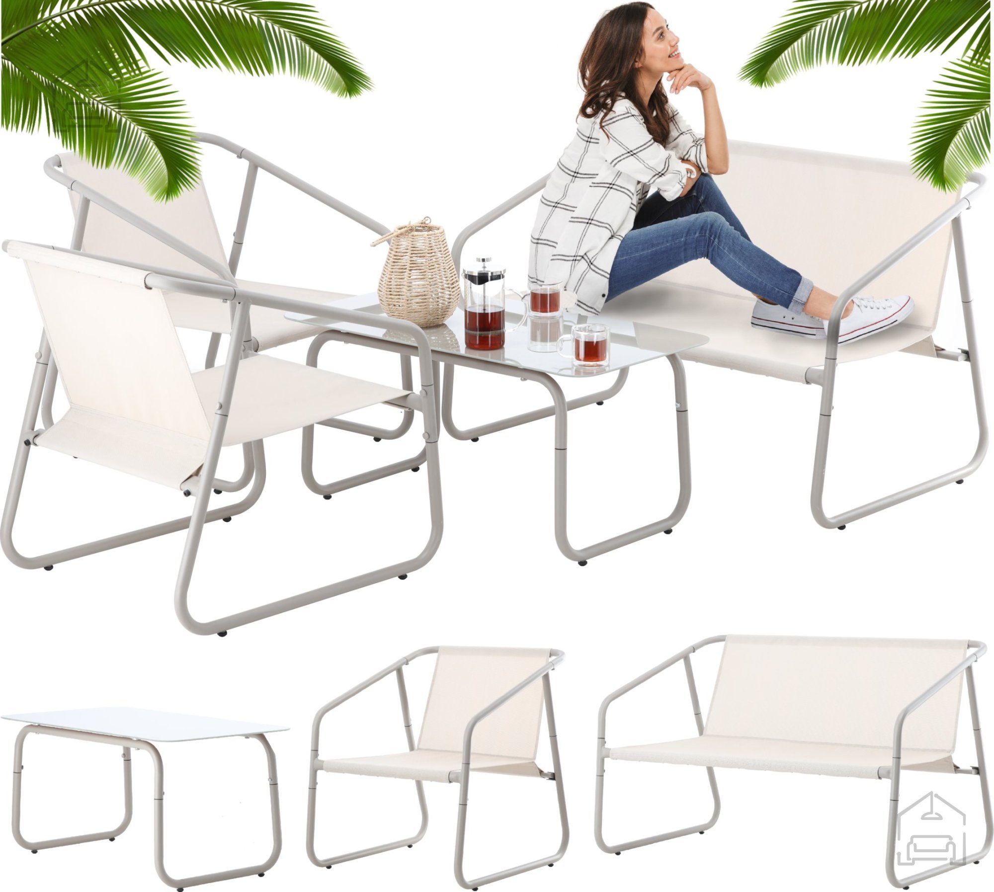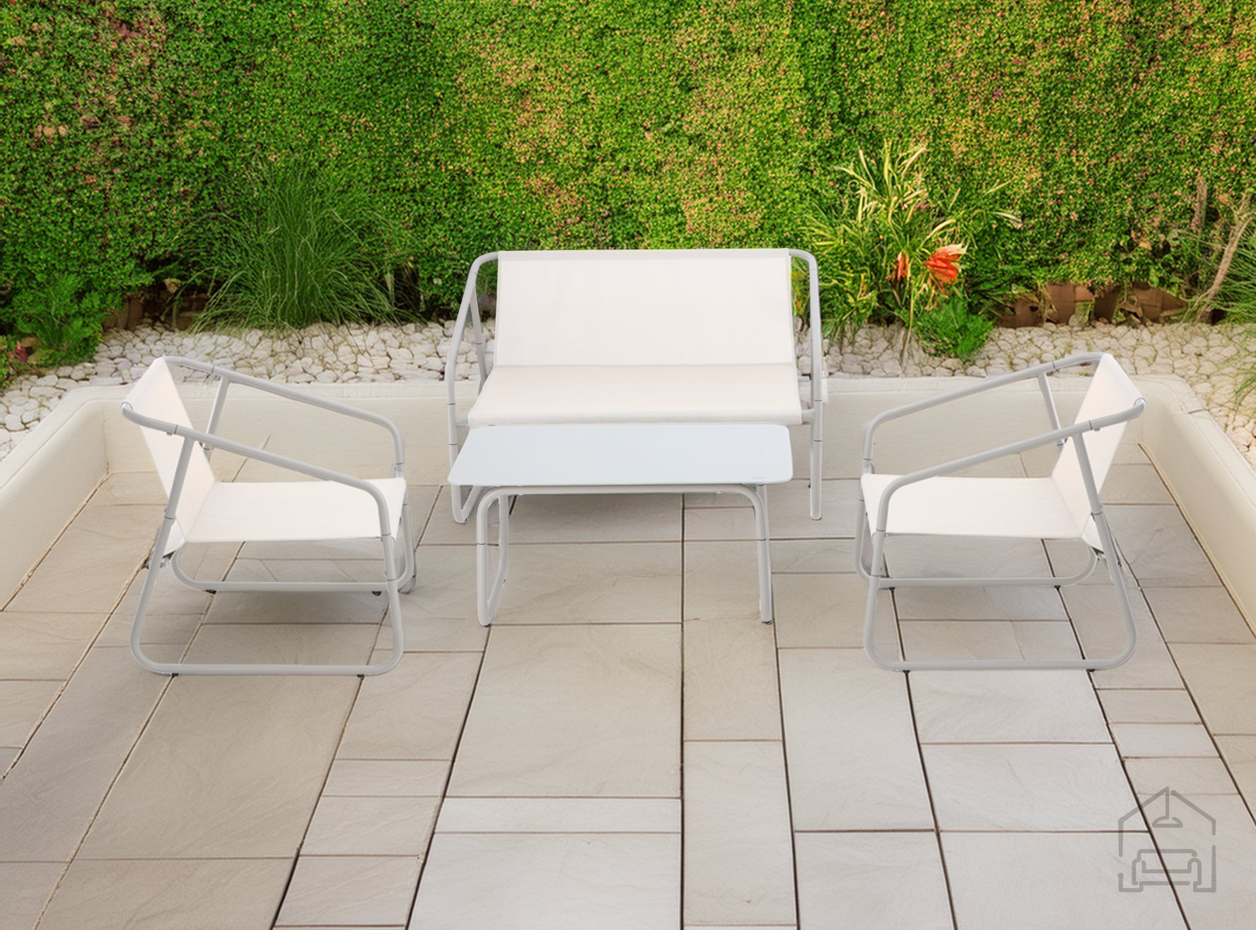 Zestav pohištva za vrt vsebuje dvosed, dva stola in mizico.